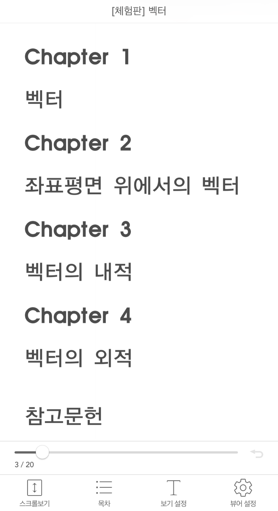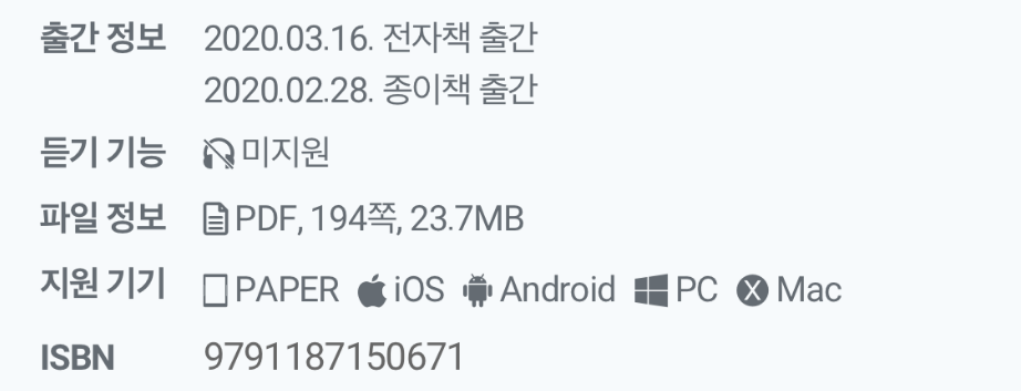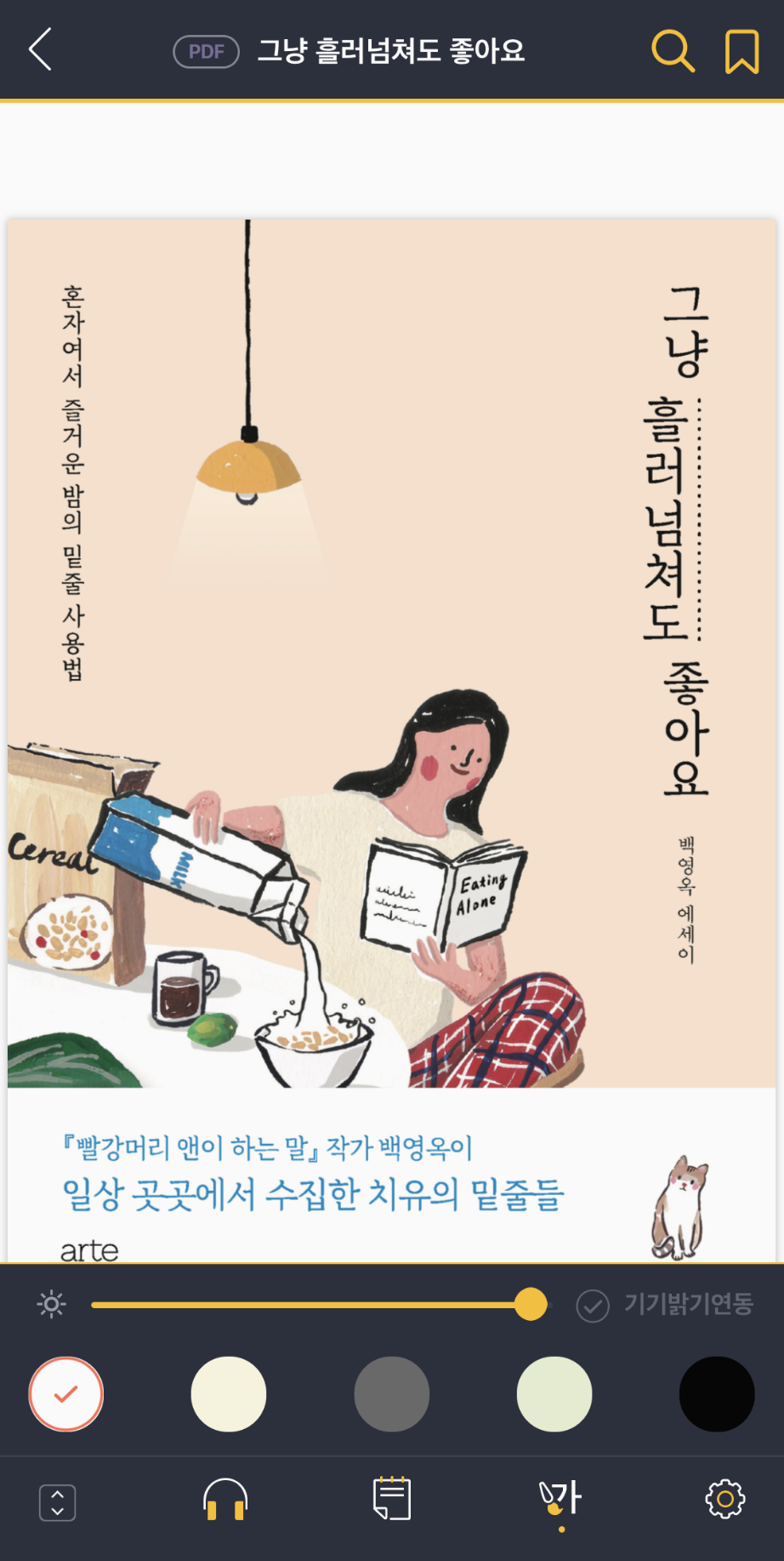 PDF의 이런 특징 때문에 개인적으로는 PDF형식의 전자책은 잘 구매하지는 않습니다. 애초에 종이책이 아닌 전자책을 구매할 때는 편리함과 더불어 커스터마이징에 있죠. 화면의 눈부심으로 눈이 피로해지는 상황에서 그걸 줄일 수 있는 유일한 통로인 전자책이 PDF라면 조금 꺼려집니다. (어쩌다 필요한 책은 PDF라도 구매하곤 합니다.)