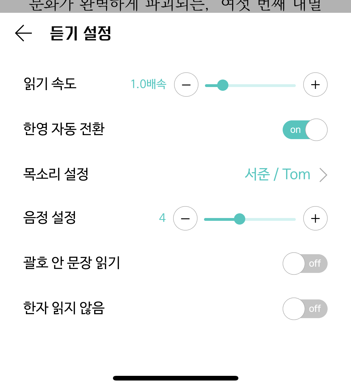 또한 ePub파일 대부분은 tts(text to speech) 기능을 지원합니다. tts기능은 파일 내 글자를 음성으로 들려주는 기능인데요. 흔히 기계음이라고 여겨지는 목소리로 내용을 읽어줍니다.