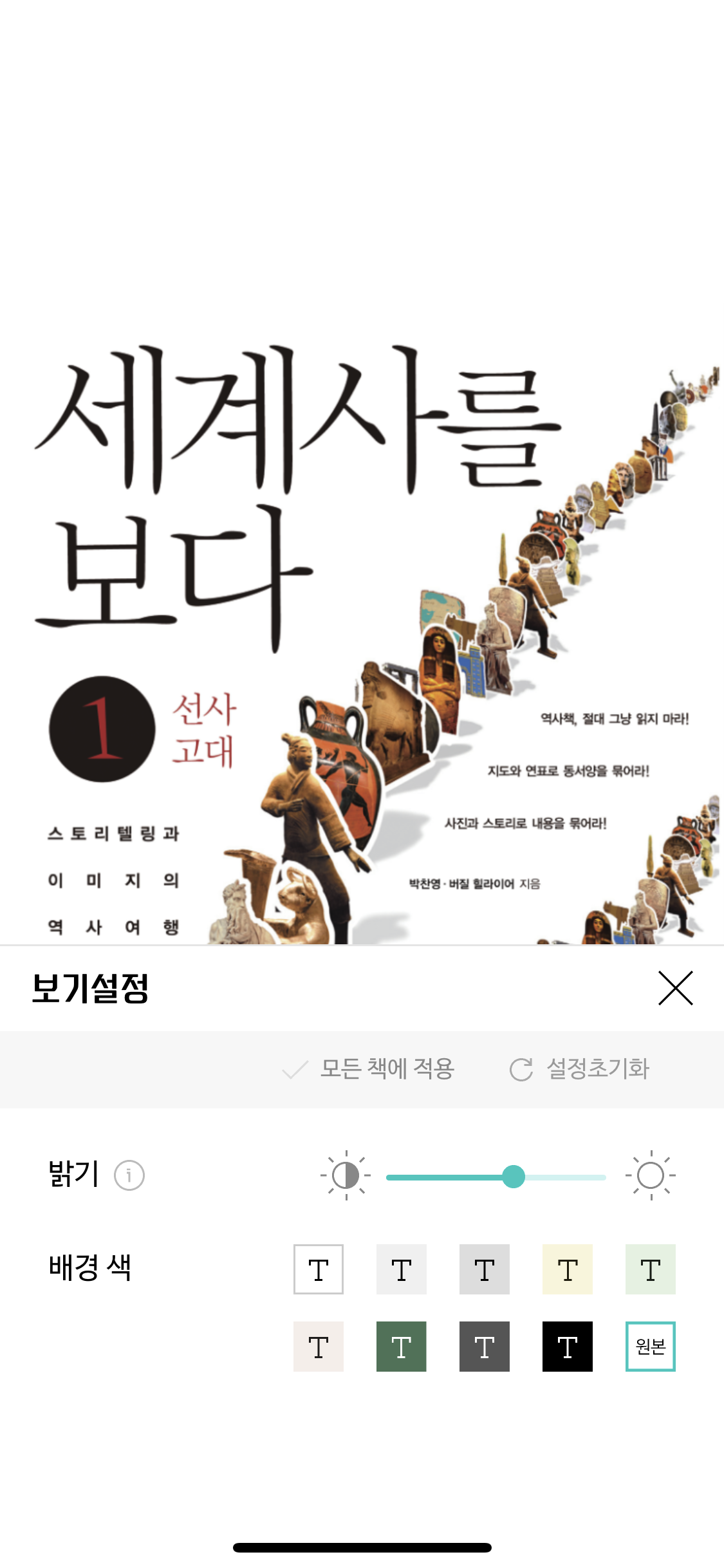 PDF형식의 파일에서 제공하는 옵션은 각 어플과 책마다 다릅니다. 밝기와 배경색 정도가 최대이지요. 고정되어 있는 글자가 작아서 보기가 불편하다면, 보통 스마트폰에서 확대하는 방식을 사용하시면 됩니다. 두 손가락으로 화면을 터치한 후 벌리는 것으로요. 흔히 아시는 PDF파일을 생각하셔도 좋습니다.