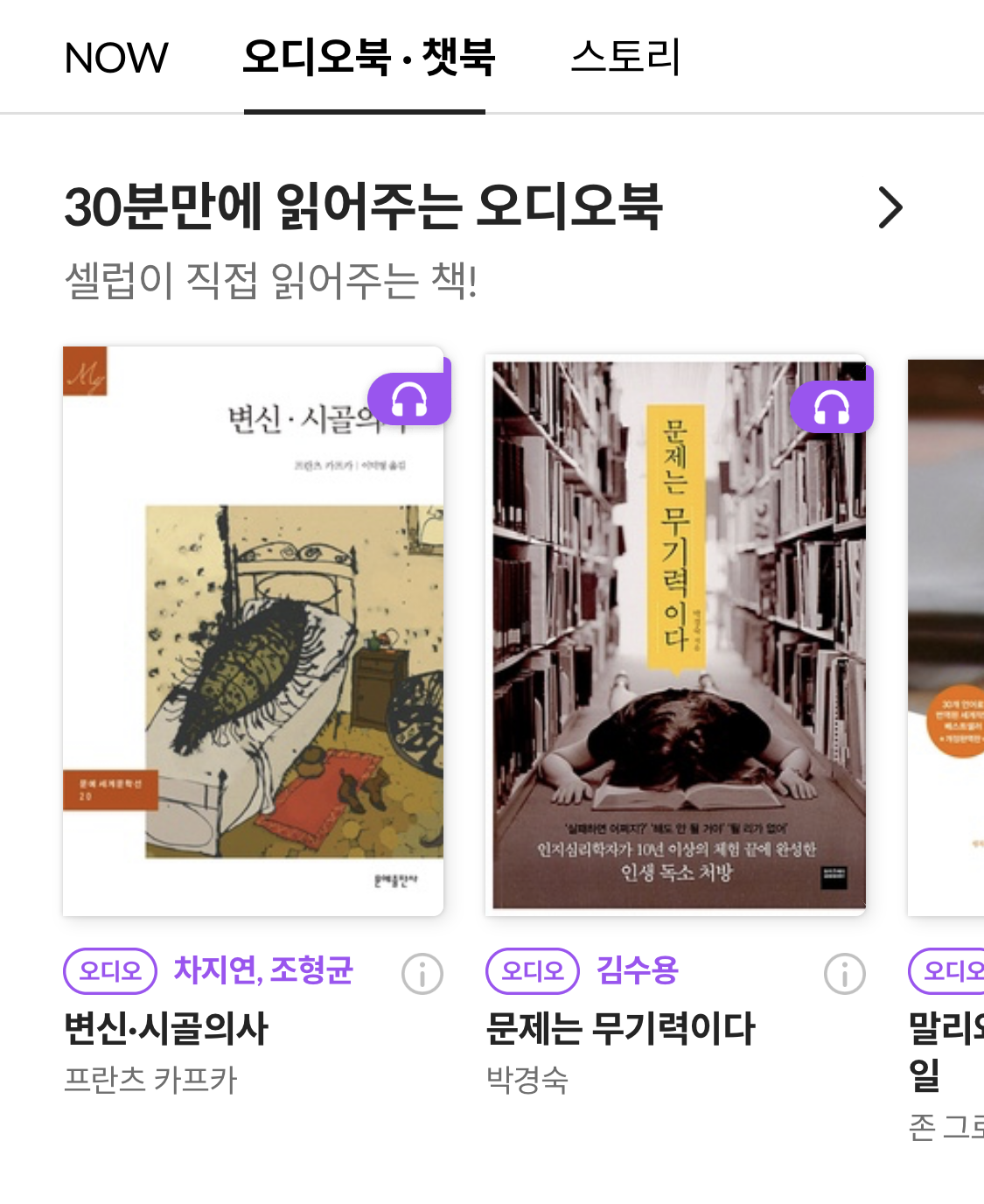 오디오북과 챗북은 밀리의 서재 메인화면에서 바로 만날 수 있습니다. 사실 밀리의 서재의 정기구독 서비스는 심플합니다. 전자책, 오디오북, 챗북. 딱 이렇게 3가지죠. (여기에 종이책 정기구독을 하는 것도 있지만 1년에 6권이면 약간 유명무실합니다.) 그만큼 단순한 서비스를 제공하고 있는 것이지요.