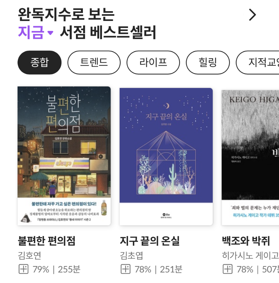 밀리의 서재의 인터페이스는 숫자와 분류로 되어 있습니다. 숫자는 완독지수로 나타납니다. 완독지수는 완독할 확률과 완독 예상 시간을 포함합니다.
