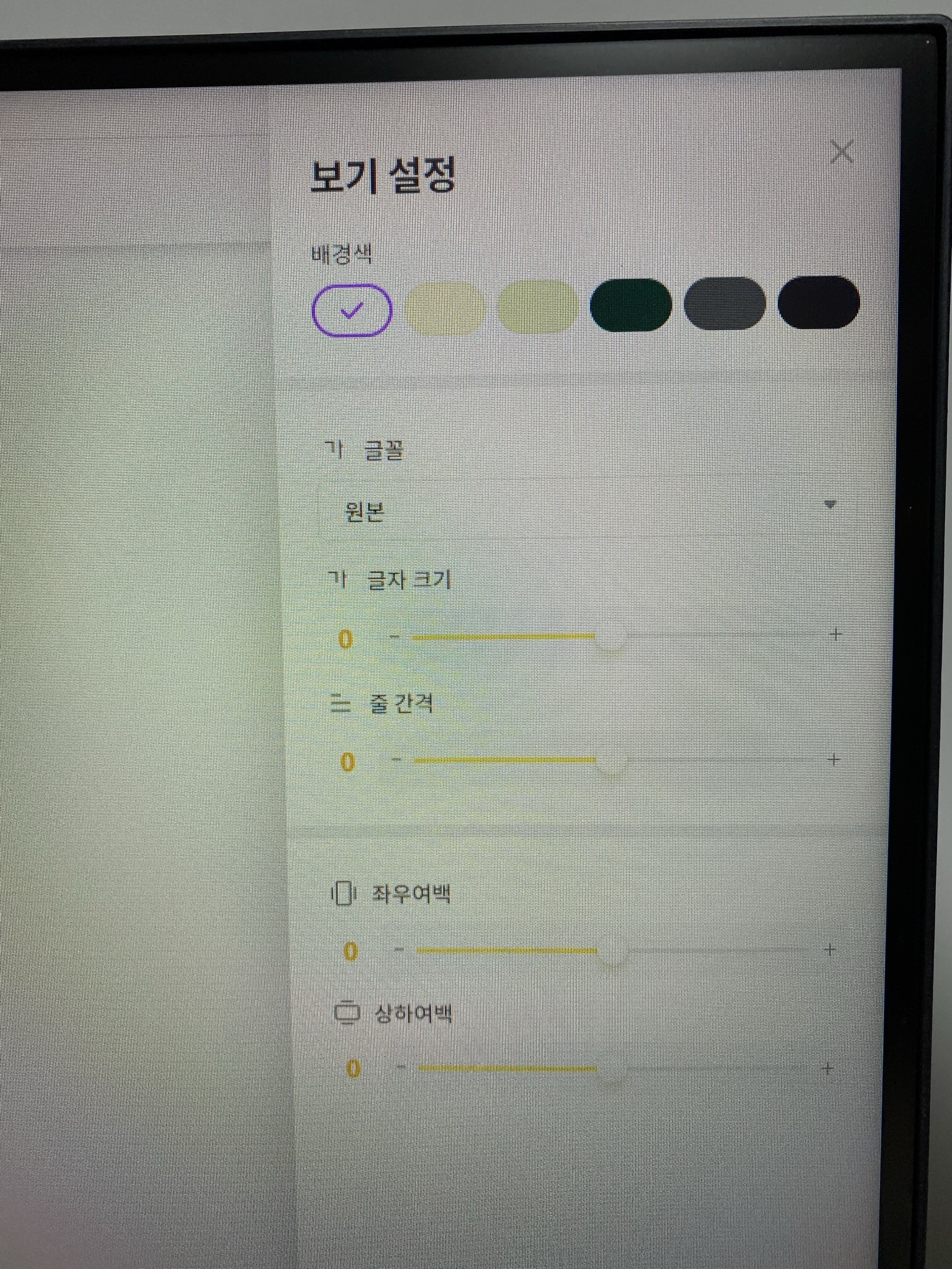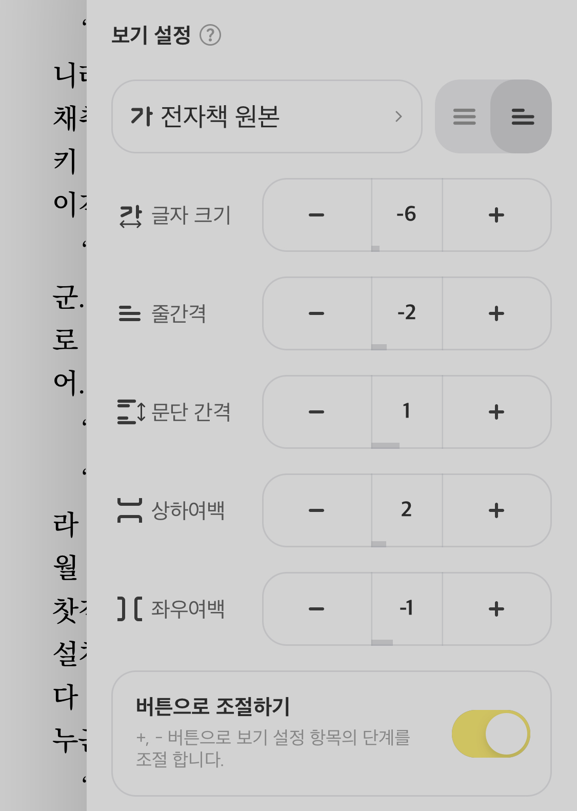 목차나 보기 설정은 한 번에 하나씩만 열어둘 수 있습니다. 글자나 줄간격 같은 보기 설정의 메뉴는 정말 기본적인 내용만 있습니다. 그리고 어플에 있는 시선추적 기능은 없습니다.
