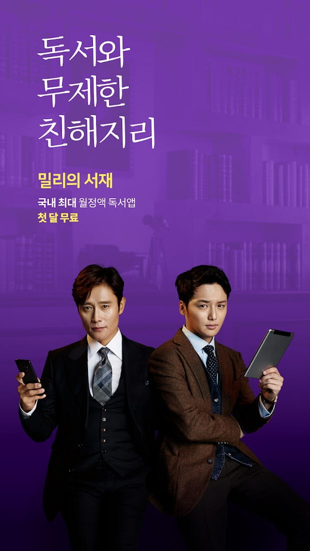 밀리의 서재가 나온 시기에 전자책 무제한 정기구독 서비스는 리디북스 정도에 불과했습니다. 교보문고 sam무제한이나 예스24북클럽도 밀리의 서재가 나온 1-2년 뒤에야 나왔습니다. 물론 일반 전자책 대여/구매는 다른 플랫폼들이 훨씬 앞서있었죠. 이런 배경에서 밀리의 서재의 광고가 나왔습니다. 유명 배우들이 출연하는 광고의 소재가 전형적이지 않은 점이 신기했죠.