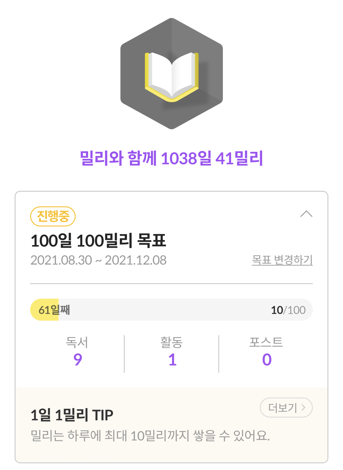 그렇다면 "1일 1밀리 목표"를 소개해드릴 필요가 있습니다. 밀리의 서재는 일정 기간(100일 또는 365일)을 기준으로 일정 수준의 밀리를 모으는 프로젝트를 계속 진행하고 있습니다. 참고로 저는 100일 기준을 선택했습니다. 아래서도 말씀드리겠지만, 밀리의 서재의 특징 중 하나가 "데이터"인데요. 데이터는 숫자로 치환할 수 있습니다. 숫자로 치환하는 것의 장점은 직관적으로 파악할 수 있다는 점과 명확한 목표와 평가를 할 수 있다는 점입니다.