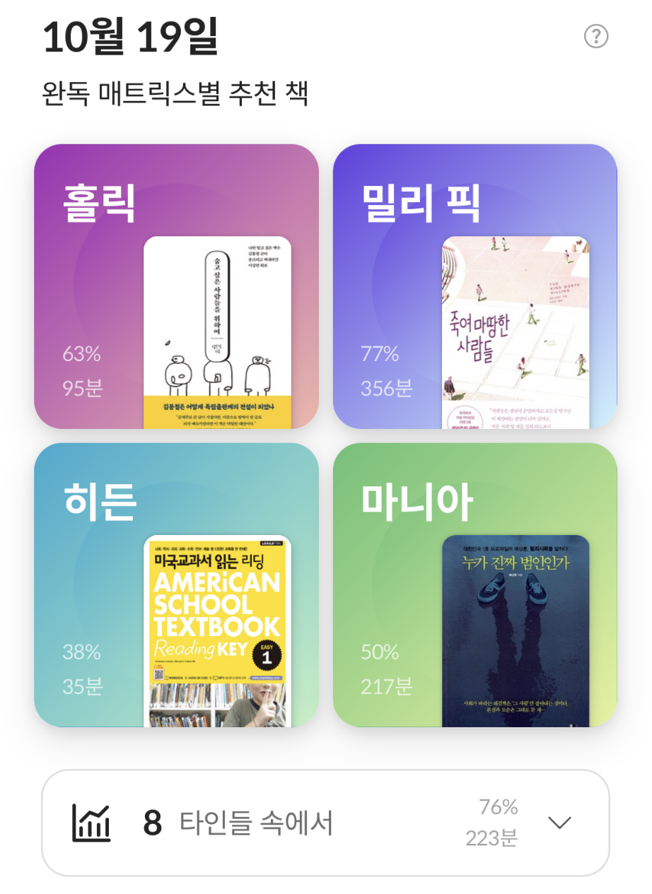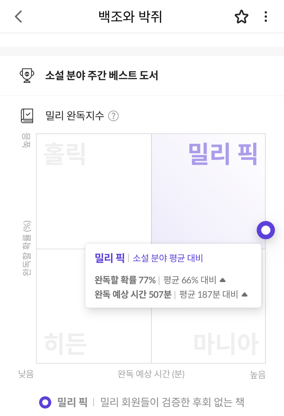 또한 분류의 경우 완독할 확률과 완독예상시간을 축으로 4개로 나눕니다. 홀릭(완독확률△, 완독예상시간▽), 밀리픽(완독확률△, 완독예상시간△), 히든(완독확률▽, 완독예상시간▽), 마니아(완독확률▽, 완독예상시간△)으로요. 단순한 통계이기에 실제와는 다를 수 있습니다. 하지만 이런 재미난 요소는 동기의 측면에서 중요합니다. 그리고 책에 대한 사람들의 인식과 시선에도 중요하고요.