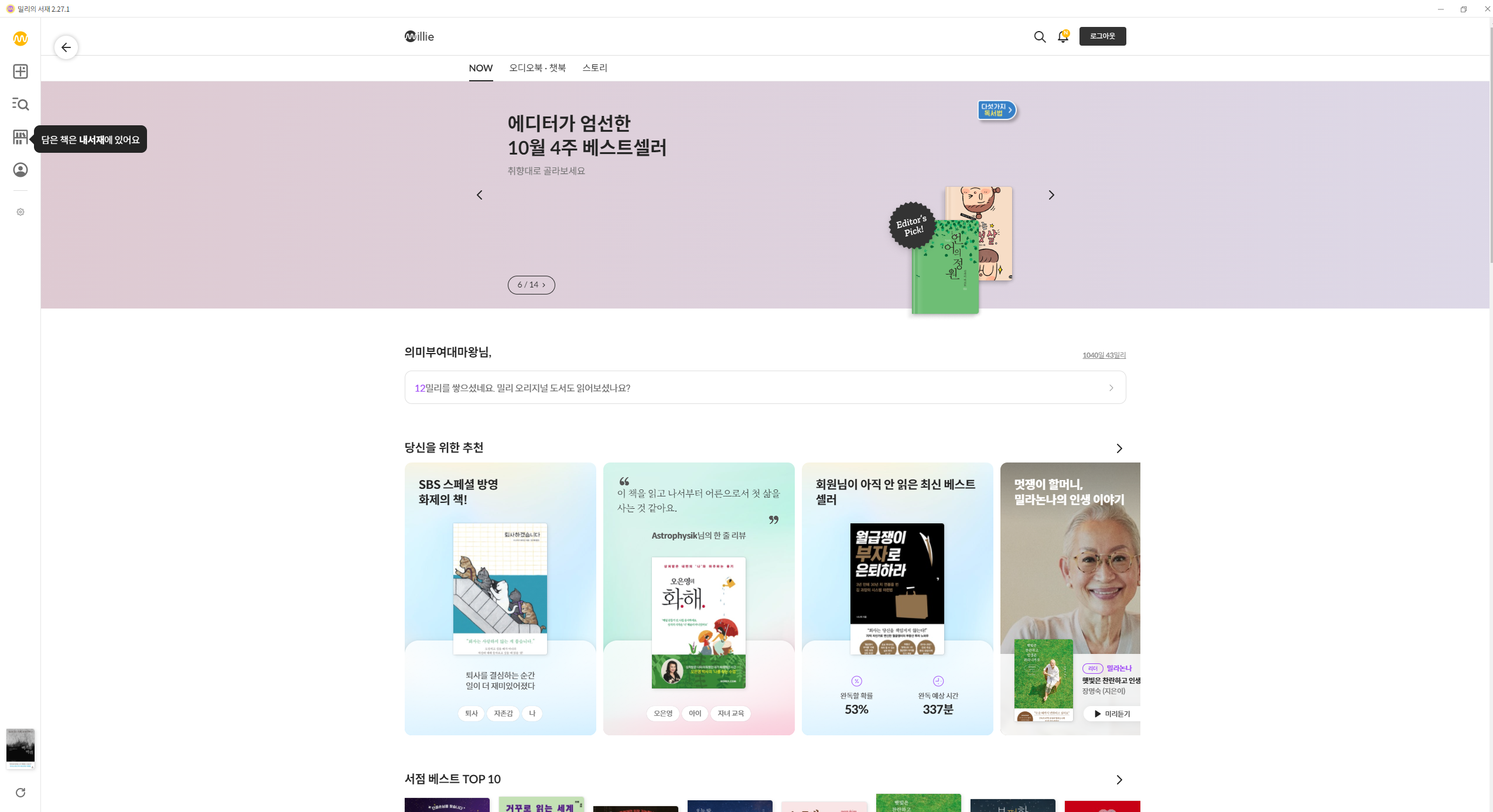 밀리의 서재는 교보문고나 예스24 등과 달리 전자책을 이용(검색, 구매, 독서까지)할 때 하나의 어플을 사용합니다. 단순히 전자책을 "판매"하지 않기 때문이죠. 구독 플랜만을 팔고 있다고 표현하면 정확합니다. 물론 종이책 구매도 하실 수 있지만, 그건 알라딘으로 넘어가서 구매가 가능하니깐요.