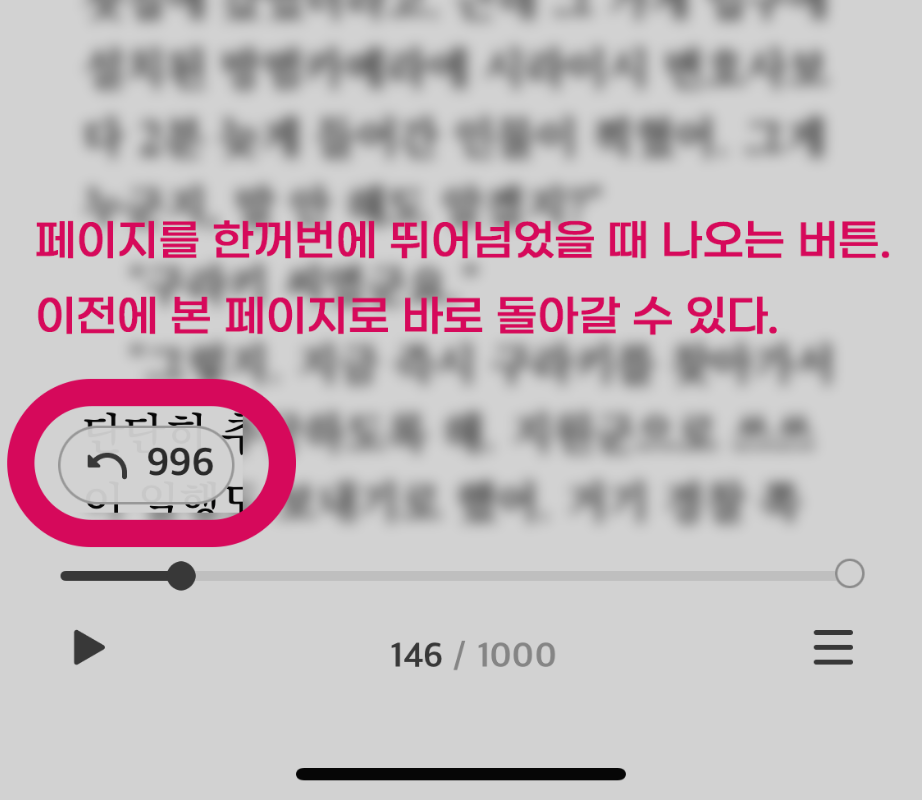 원하던 페이지를 책갈피 해두셨다면, 책갈피 버튼을 눌러서 들어가시는게 모든 어플에서 동일한 과정일 것입니다. 그런데 만약 어떤 페이지를 보다가 내용을 찾고 싶어서 후루룩 갔다가 돌아가려면 어떻게 해야할까요? 책갈피를 사전에 해두고 가는 것도 방법이지만 효율이 너무 떨어집니다. 밀리의 서재 어플에서는 이런 면에서 편리합니다. 좌측 하단에 이전에 갔었던 페이지가 뜨는 거죠. 이 버튼 하나만 눌러도 쉽게 해당 페이지로 갈 수 있습니다. 책갈피를 했다가 해지하는 과정을 거치지 않고서요.
