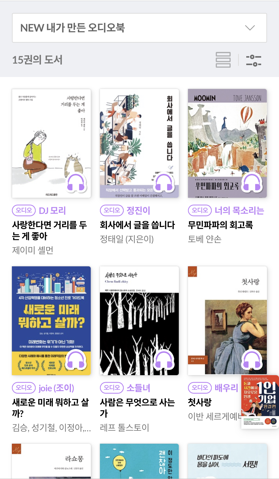 지금은 교보문고, 알라딘 등에서도 오디오북을 접하실 수 있습니다. 하지만 이것을 먼저 론칭하고 정교화하고 있는 곳이 밀리의 서재입니다. (다른 플랫폼은 밀리의 서재가 터놓은 길에 발을 들여놓았다고 저는 보고 있습니다.)