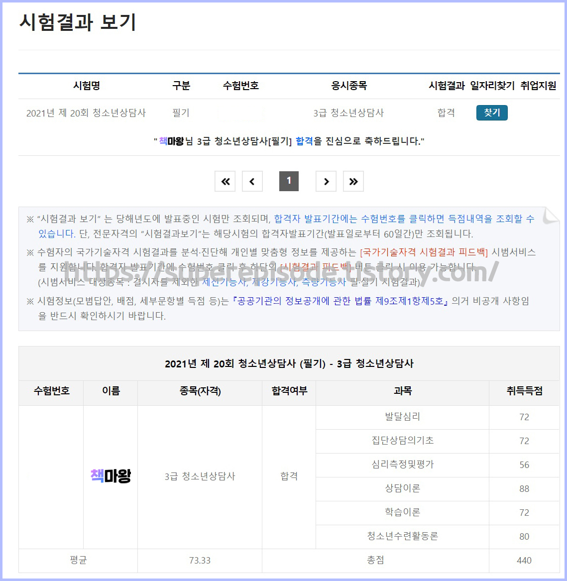 필기 시험 결과가 나왔다. 가채점 결과와 같이 심리측정및평가만 60점을 넘지 못했다. 그렇지만 결과적으로 평균 60점 이상, 각 과목 40점 이상으로 필기를 합격했으니 만족한다.