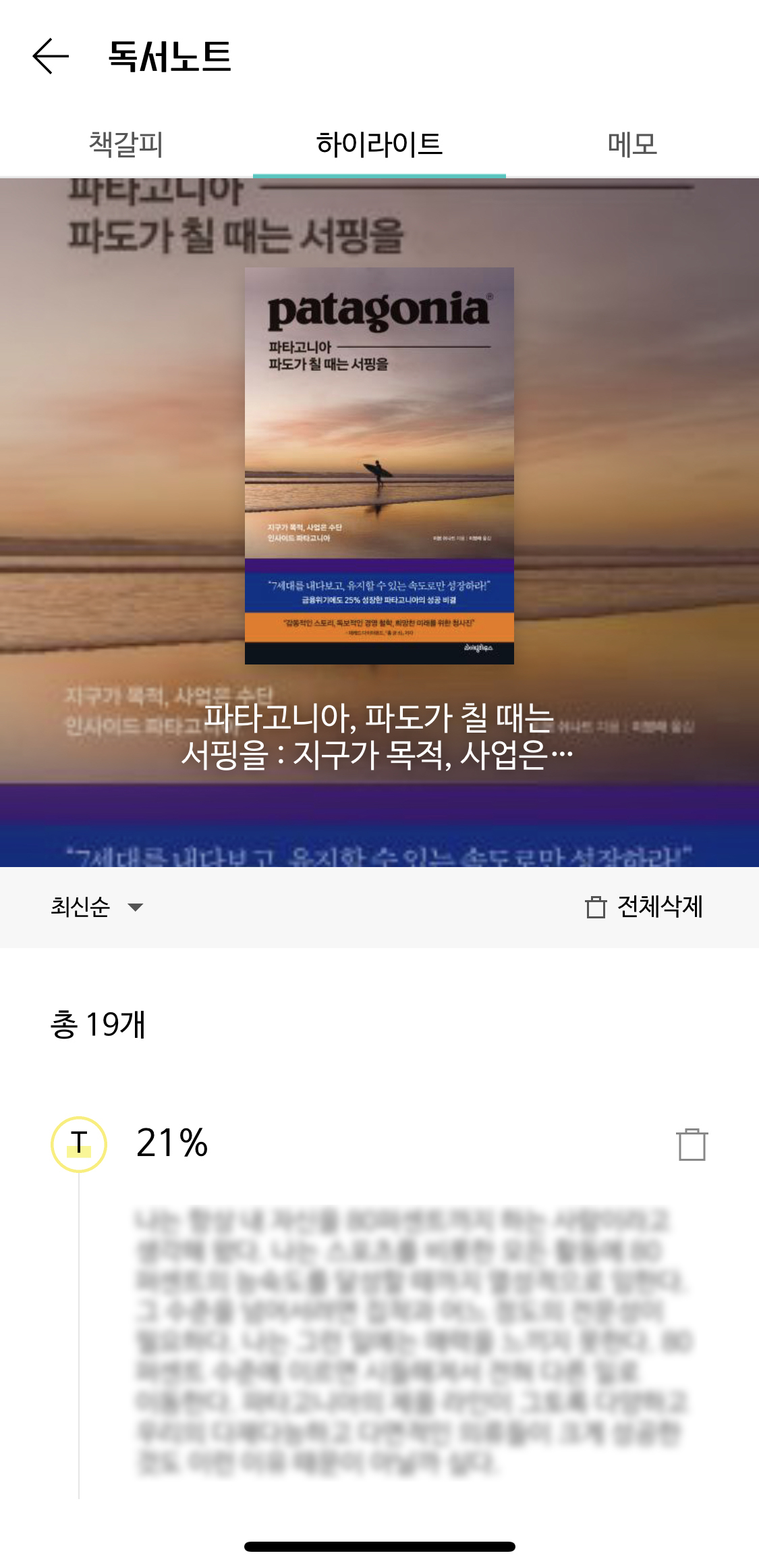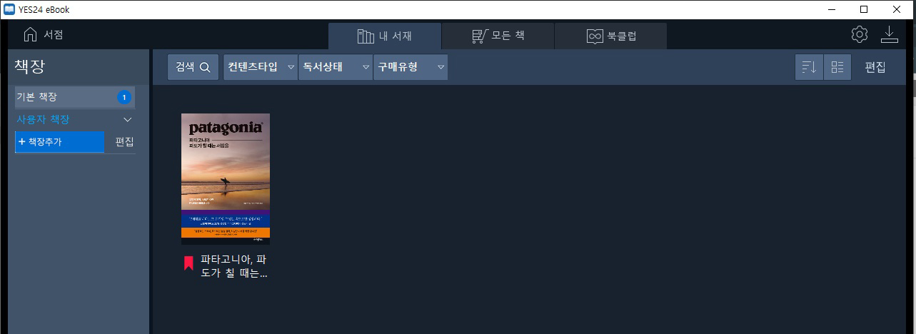 다운로드를 받으신 책은 내 서재에 나타납니다. 어플에서부터 이어진 파타고니아가 화면에 있습니다. 보통 독서를 스마트기기의 어플로 하기 때문에 pc버전에서는 필요한 책만 다운로드 받곤 합니다.