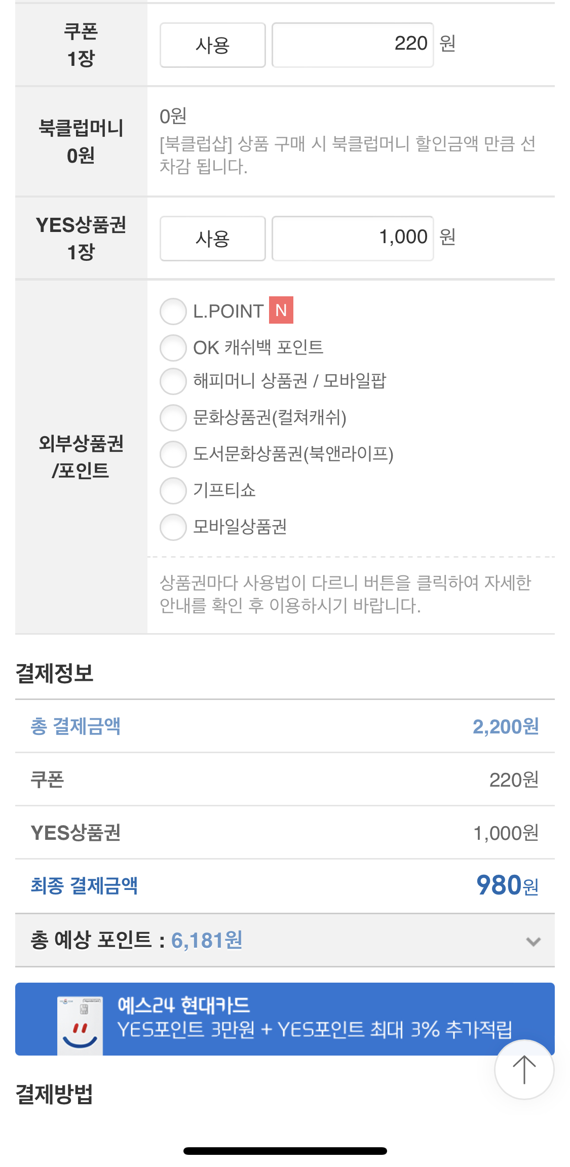 그래도 쿠폰, YES상품권, YES머니 등과 함께 사용할 수 있기 때문에 이를 활용하시면 됩니다. 교보문고처럼 월 초에 적립 2배 이벤트를 상시 진행중이니 이때 충전하시면 좋습니다. 다만 매월 자동충전하는 기능은 없습니다.