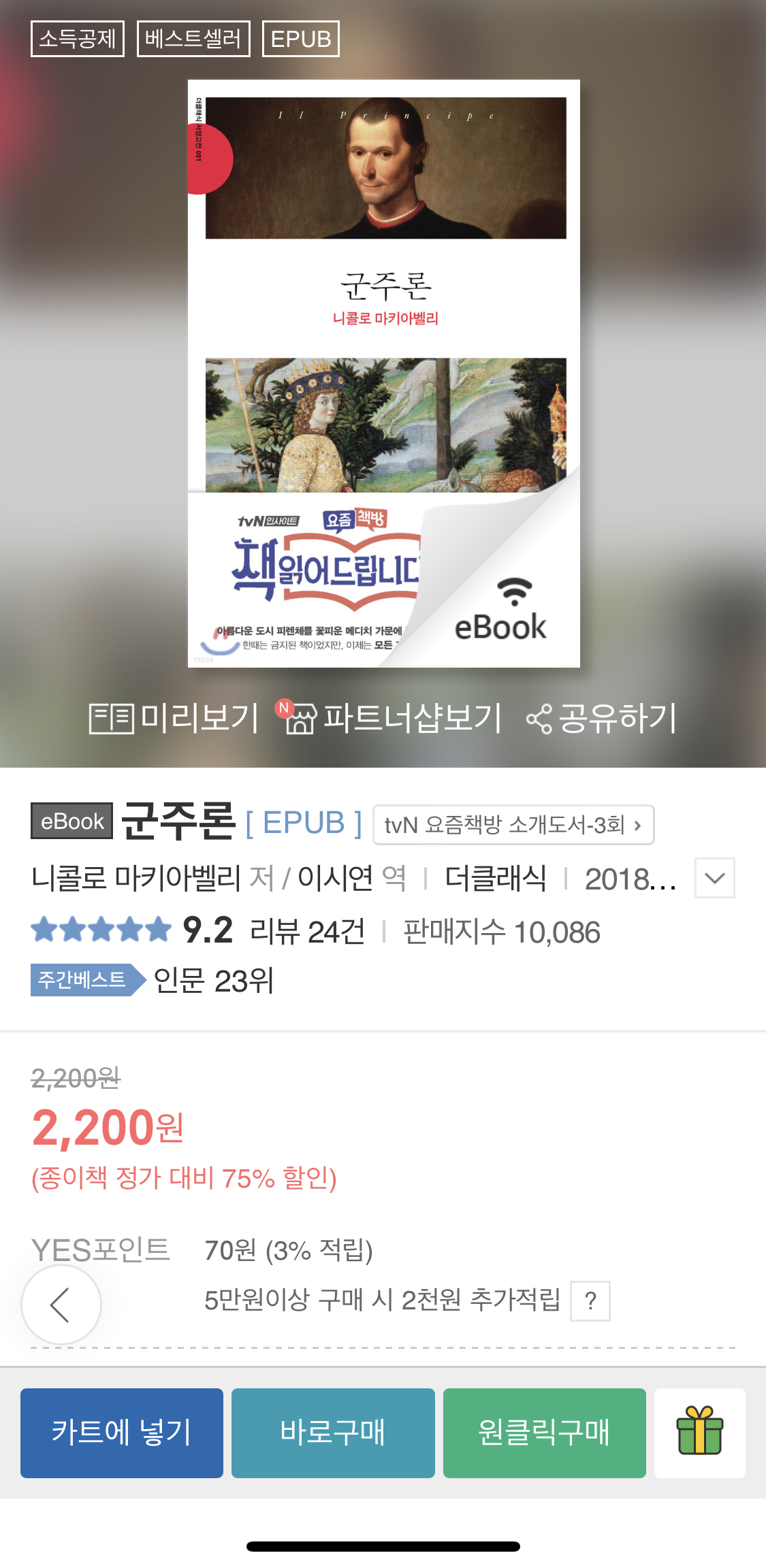 예스24에서 전자책을 이용하는 이유는 이 질문들에 ok사인이 내려졌기 때문입니다. 예전이라면 개별 전자책도 예스24에서는 거들떠보지 않았을 텐데요. 어플은 환골탈태 후에 비교적 편리해졌습니다. 제가 자주 이용하던 인터넷 서점 중에 하나가 예스24였고요. 예스24에서 주말마다 주는 상품권, 매월 주는 상품권 등은 개별 전자책 또는 종이책도 구매하기에 괜찮습니다.