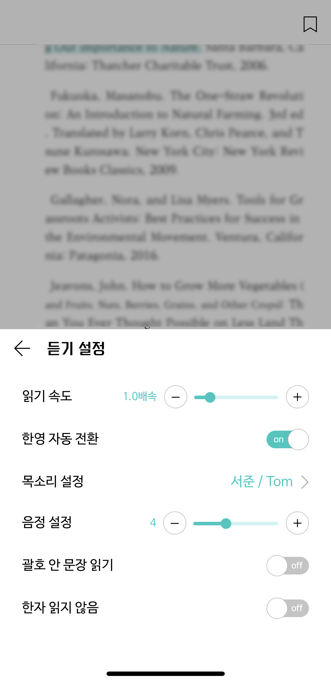 듣기 설정 또한 다른 곳과 큰 차이는 없습니다. 읽기 속도는 0.5배속~4.0배속까지 범위에서 조절 가능합니다. 목소리는 한글과 영어 모두 남여 목소리 1개씩 있습니다.