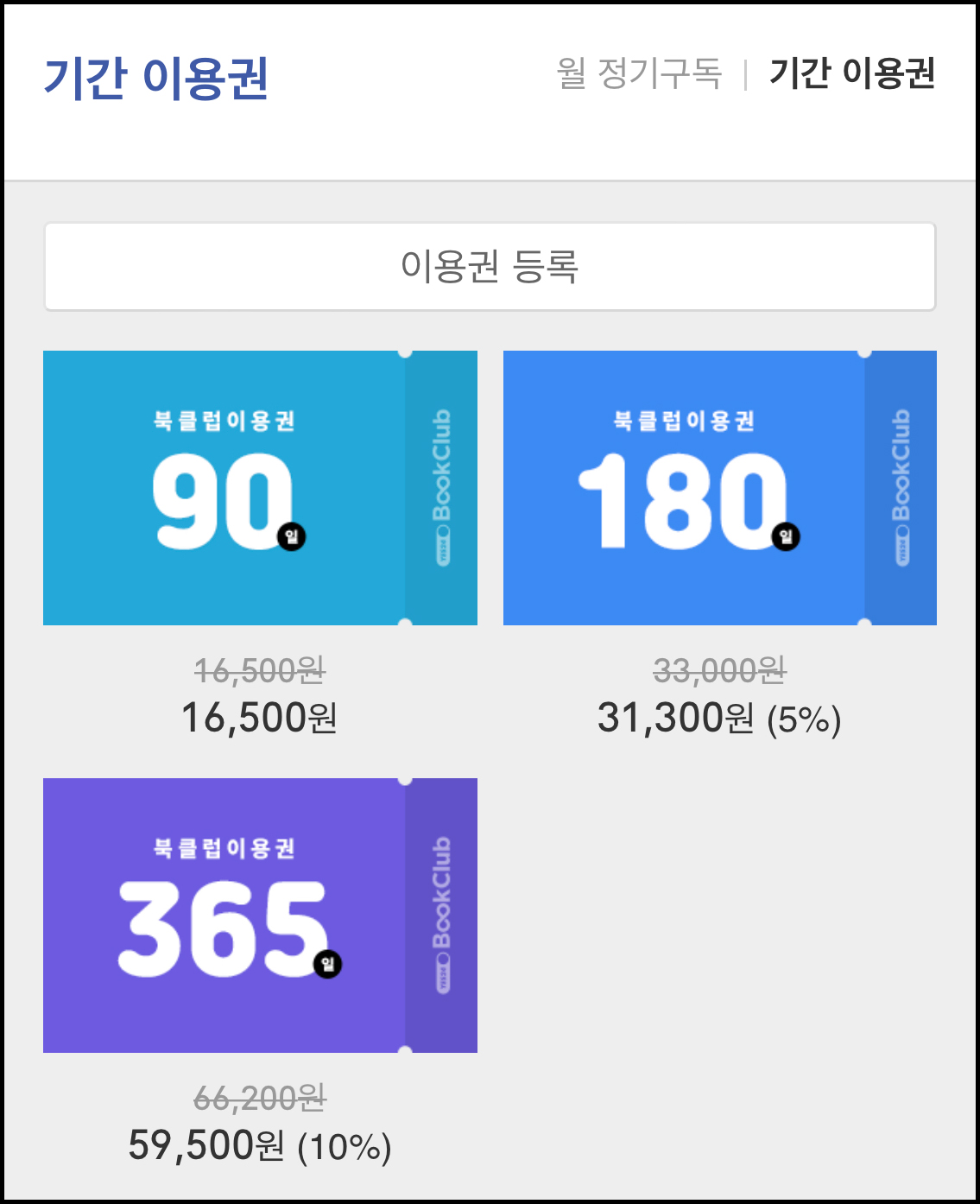 그렇지만 기간이용권의 이용방법은 월 정기구독에 비해 불편합니다. 이용권이 카톡으로 오는 것과 그걸 등록하는 과정을 생각하면, 그냥 카드 등록해서 자동으로 결제되는 게 편하지요. 그저 교보문고sam 포스팅에서 말씀드린 것처럼, 권수가 정해져 있거나 기간이 정해져 있으면 나름의 유익이 있다는 정도가 장점으로 꼽을 수 있습니다. 그래도 90일 즉 3개월은 성실히 책을 읽기엔 좀 길다는 생각이 드네요.
