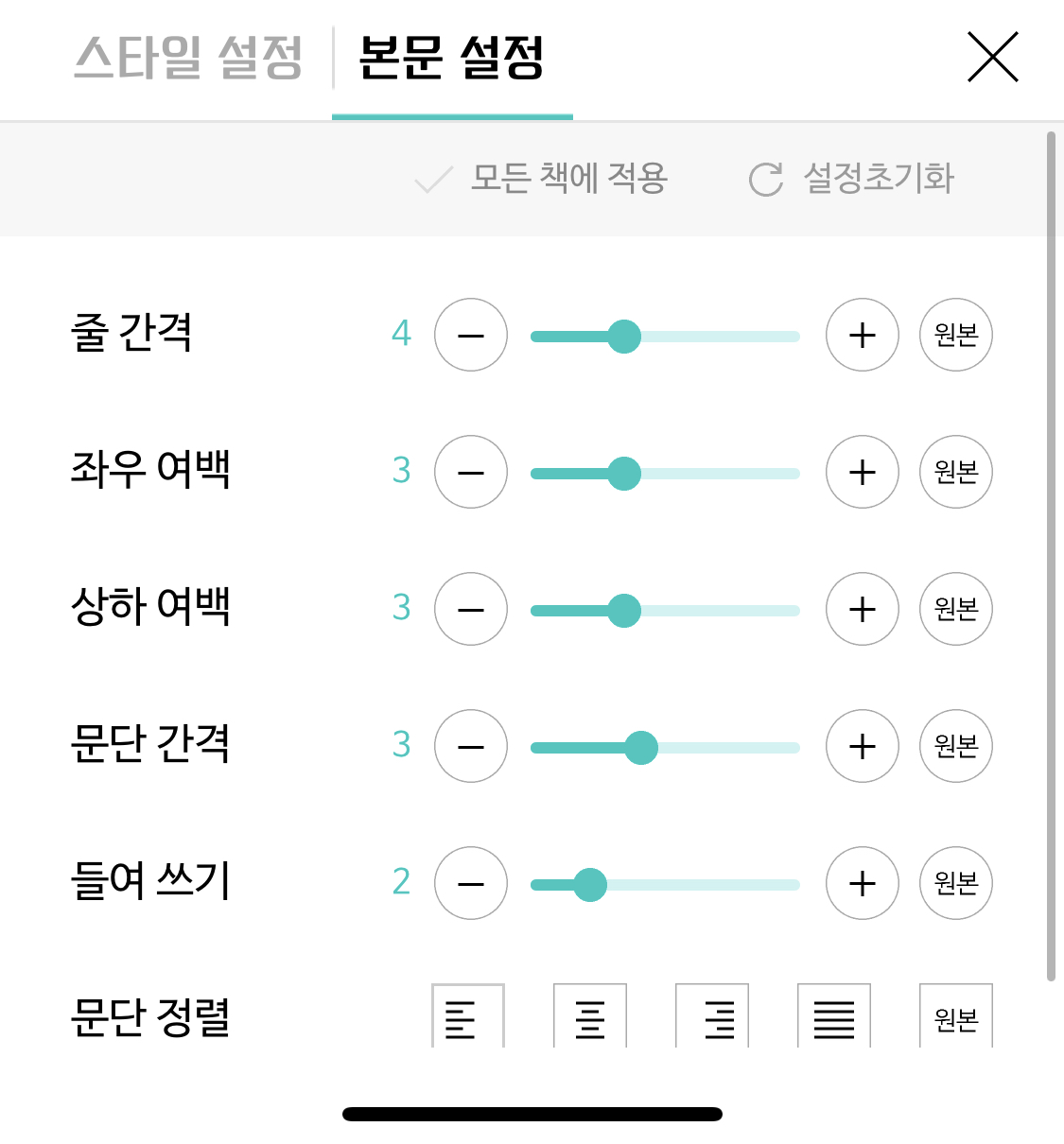 보기 설정은 밀리의 서재가 넘사벽이므로 넘어가겠습니다.
