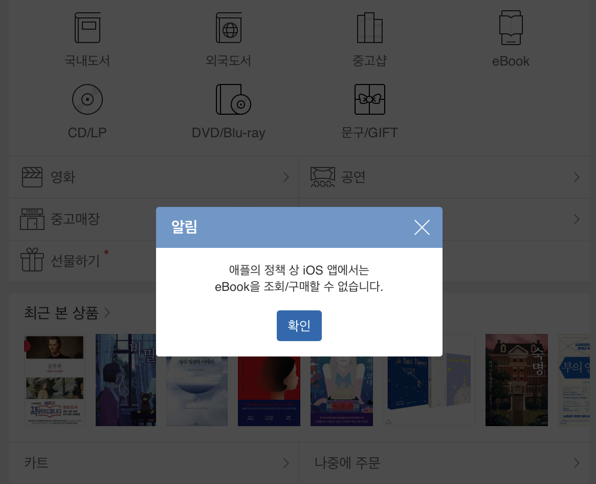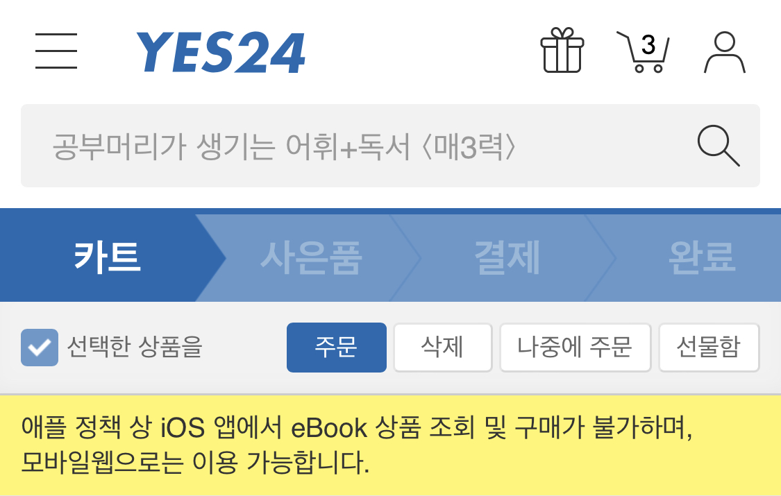 이전 포스팅인 교보문고, 이후 포스팅인 알라딘에서는 전자책을 구매하기 위해서는 어플이 아니라 사파리(safari) 등의 브라우저를 사용했어야 합니다. 그런데 어찌저찌해서인지 어플(모바일앱)인데 모바일웹 형식으로 되는 때가 있습니다. 어플 자체가 브라우저의 기능을 가지게 된 것 같은데요. 이런 분들은 자동 로그인이 계속 풀리는 현상을 겪는 것 같습니다. 또한 이렇게 어플이 모바일웹 형식으로 작동을 하면 그냥 어플을 통해서 전자책을 조회하거나 구매를 할 수 있습니다. 아래 이미지를 보시면 제가 겪은 것을 보실 수 있습니다.