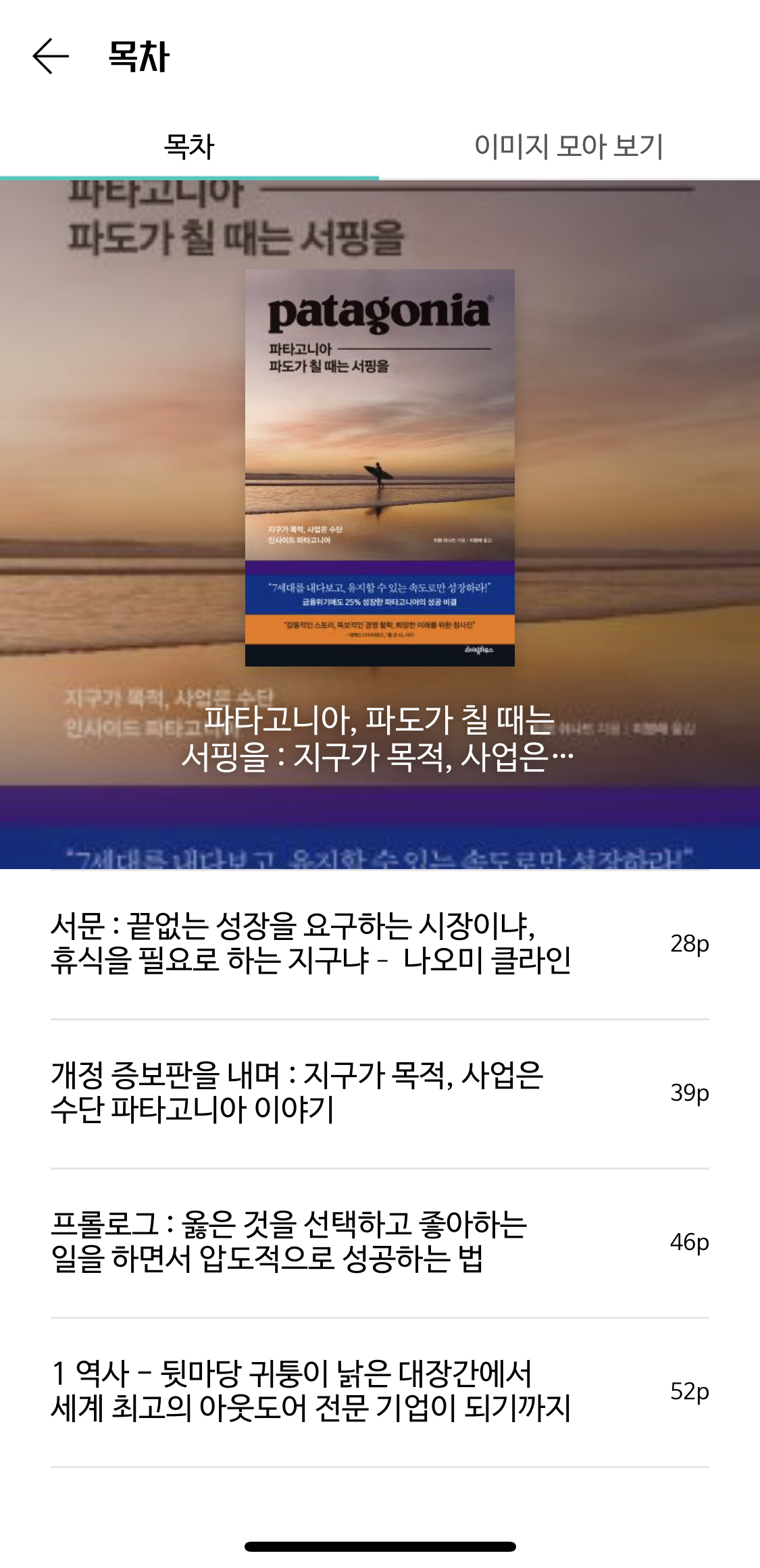 목차 섹션에서는 "이미지 모아 보기"를 뽑아 보고싶은데요. 목차야 뭐 그냥 기본적인 내용이니깐요. "이미지 모아 보기"는 책에 있는 이미지들을 모아서 볼 수 있는 영역입니다. 위에 이미지에는 제가 읽은 파타고니아에 나온 이미지들을 볼 수 있습니다. 보통 이미지가 어디에 있는지 찾기도 힘든데, 이렇게 찾아보면 아주 쉽습니다. 참고로 각 이미지를 터치하면 크게 볼 수 있습니다.