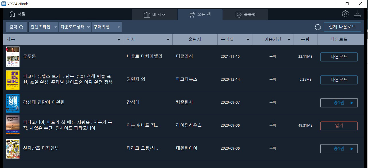 보유한 책은 다운로드를 해야 볼 수 있습니다. 그리고 시리즈로 된 책은 총 권수가 적혀 있어서 그 버튼을 통해 들어간 화면에서 다운로드 받으셔야 합니다.
