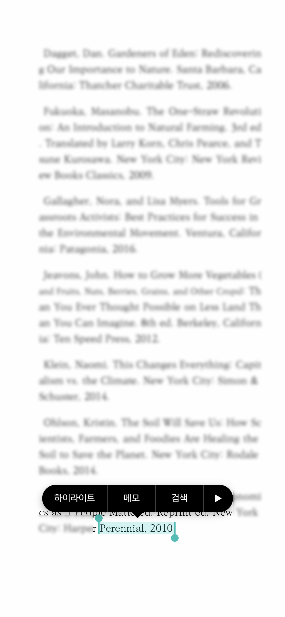 이미지에는 나오지 않지만 예스24eBook 어플이 업데이트 하기 전에는 밑줄을 다음 페이지와 이어서 긋는 게 너무 힘들었습니다. 마지막 포인터를 쭈욱 끌고 가면 다음 페이지가 조금씩 옆에서 나왔거든요. 거기서 적당히 손가락의 속도를 줄여줘야 하는데, 그걸 실패하면 갑자기 몇 페이지 더 넘어갔습니다. 이런 힘들었던 기억이 있기에 수 년 전 어플의 업데이트 소식은 감격스러웠습니다. 물론 아직도 보완할 점이 많기 때문에 그 이후로 계속 지켜보고 있습니다.(과거 어플을 찍어둔 게 있을 텐데 찾아서 나왔으면 좋겠네요.)