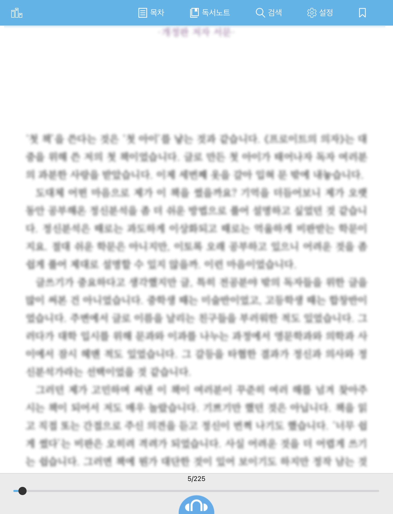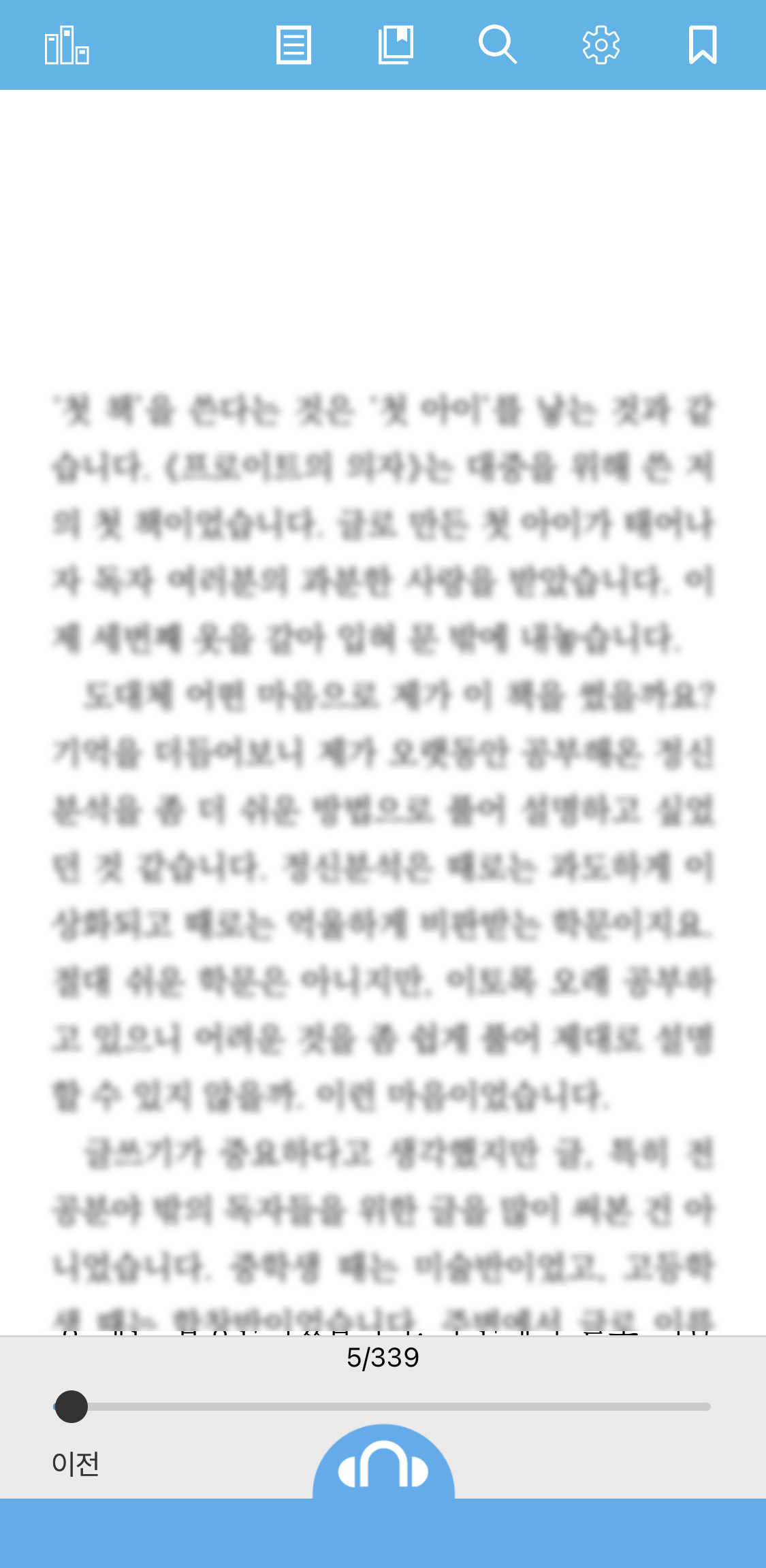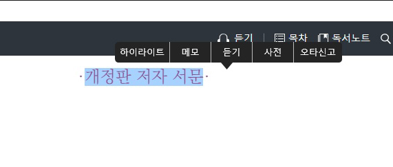 독서화면입니다. 여기도 어플과 마찬가지로 대부분의 메뉴가 위에 있습니다. 아래에는 페이지의 진행만 표시됩니다.