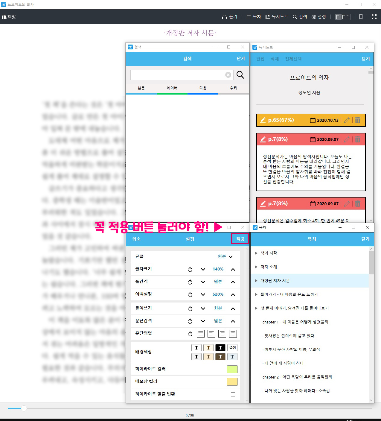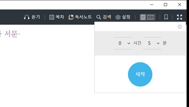 독서화면의 메뉴는 모두 중첩이 됩니다. 한번에 다 틀어놓을 수 있다는 의미입니다. 리디북스도 중첩이 가능했죠. 저는 예스24를 비롯한 다른 pc뷰어처럼 메뉴가 한 번에 하나일 때를 좋아합니다.