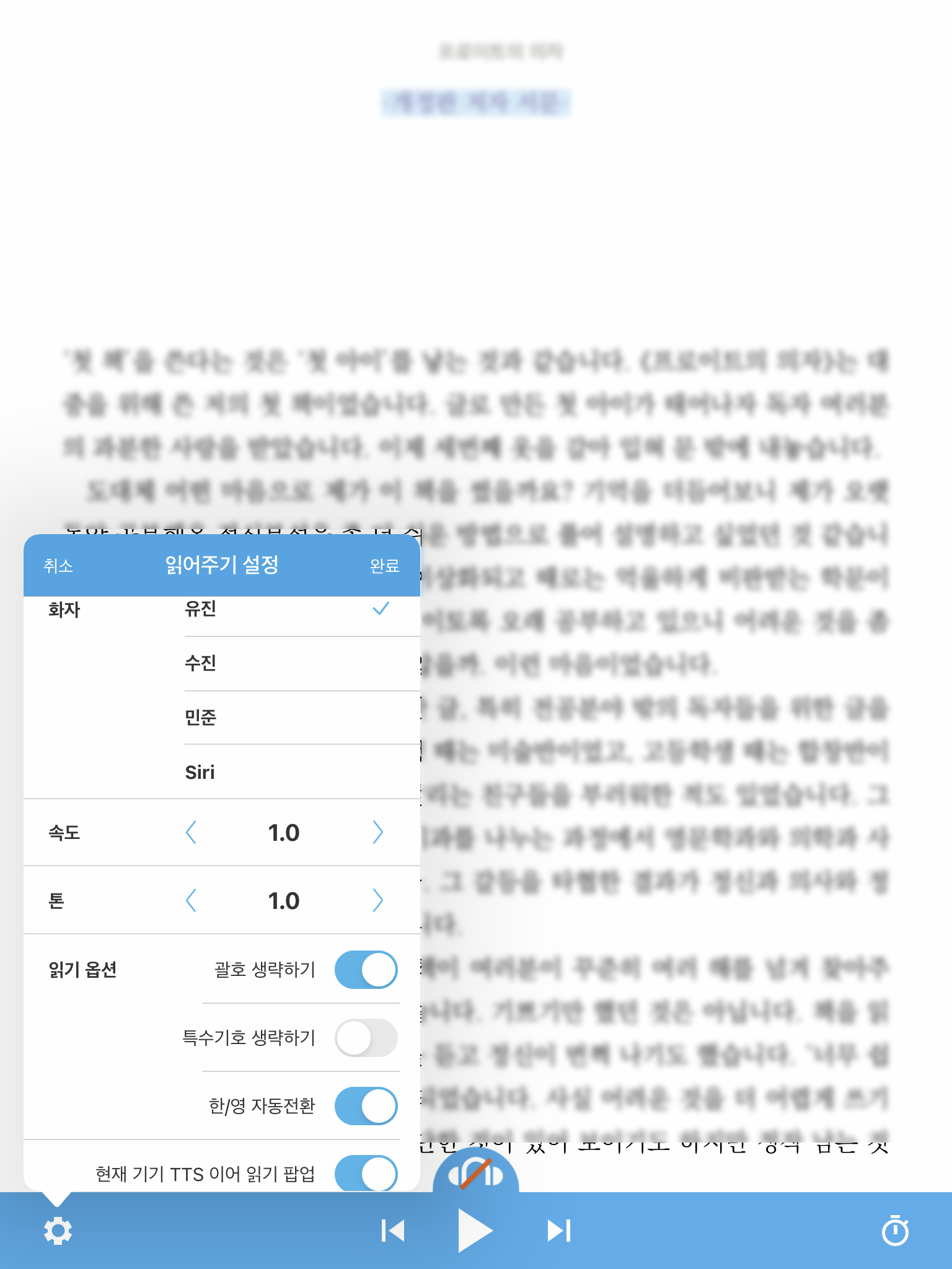 알라딘eBook 어플의 TTS는 위와 같은 형식으로 되어 있습니다. 화자는 세 명입니다. 속도는 0.0부터 5.0까지 조절 가능합니다. 톤은 0.1부터 2.0까지 가능하고요. 조정하실 일이 있을지는 잘 모르겠습니다. 디폴트 상태가 최고입니다.