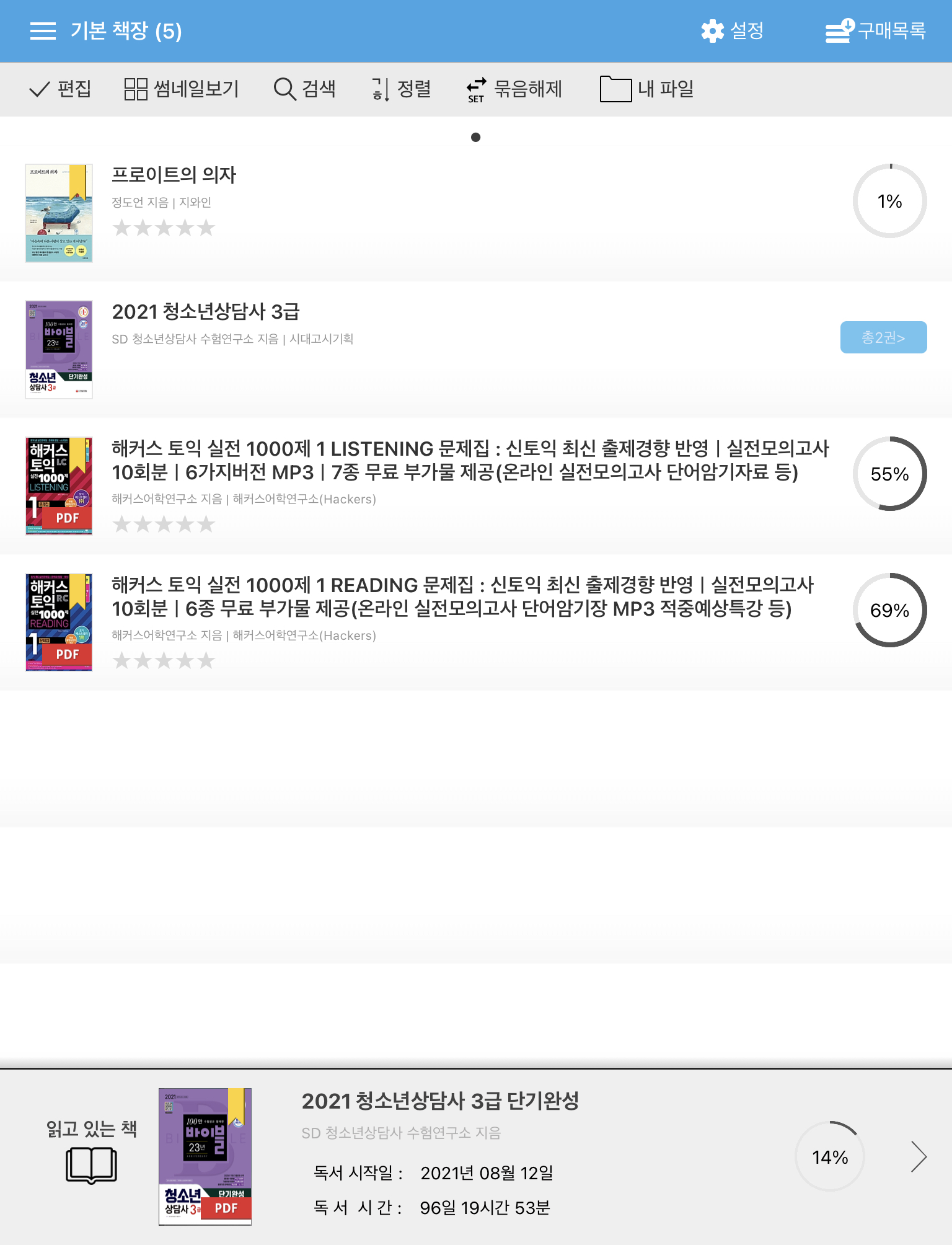 또한 구매목록과 마찬가지로 "썸네일로보기"로 된 위의 이미지를 "리스트보기"로 바꾸면 어플에서의 모습과 같이 변합니다. 즉, 해당 책을 읽은 정도(%)와 별점까지 표시됩니다.