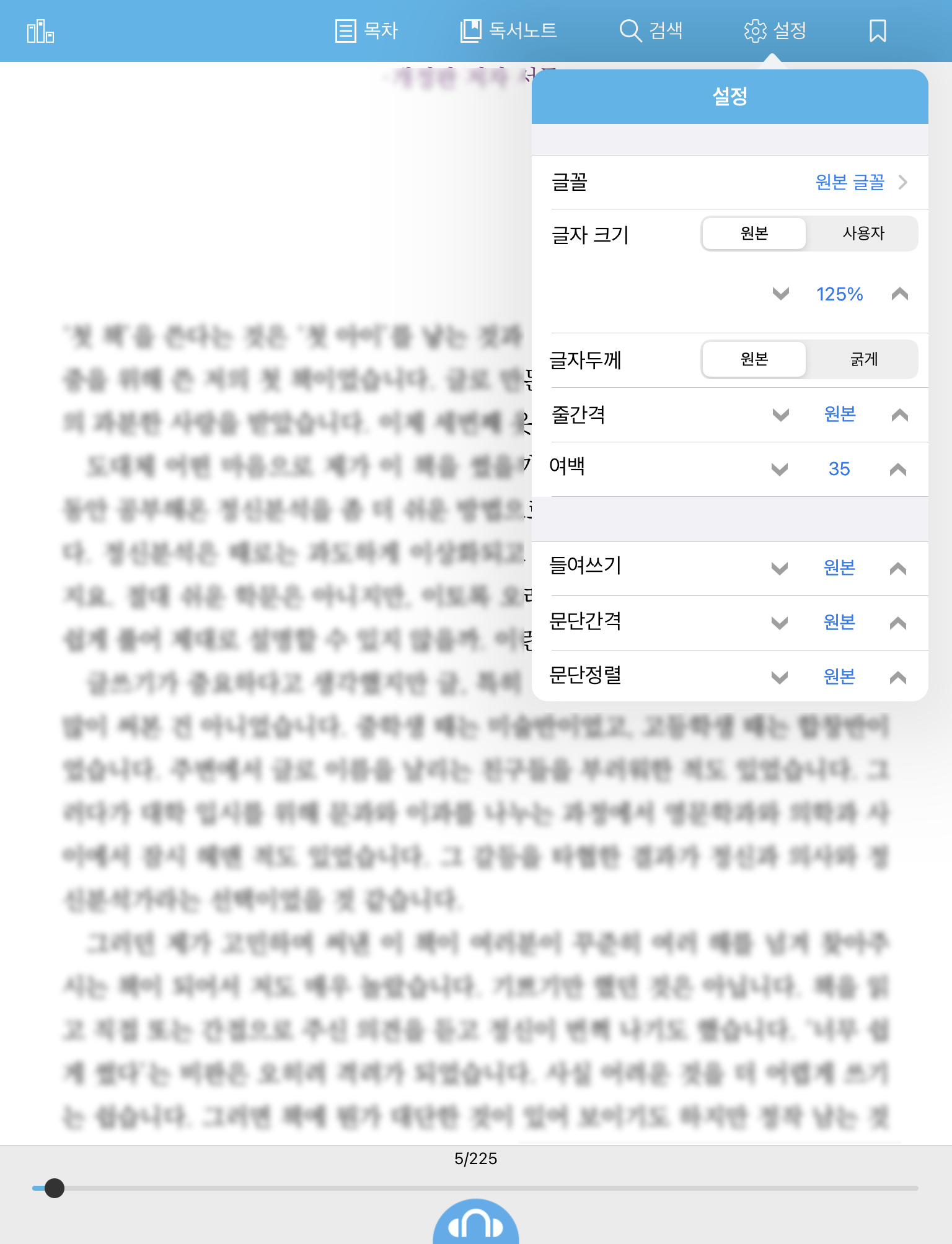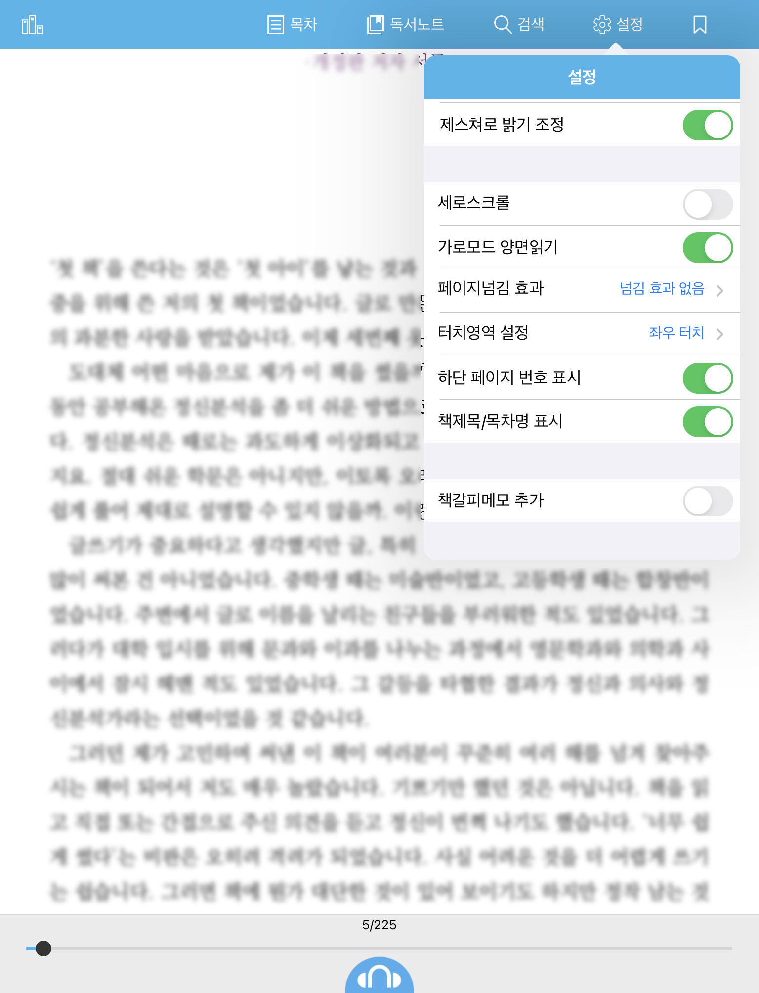 참고로 아이패드 버전이 아이폰 버전보다 좋다고 보는 지점이 있는데요. 그건 바로 설정 메뉴 중에 "책제목/목차명 표시" 때문입니다. 이건 오직 아이패드에서만 볼 수 있습니다. 독서를 할 때 본문을 제외한 자잘한 내용을 화면에서 보고 싶어하지 않는 저로서는 이 메뉴가 참 좋았습니다. 신버전에서도 이는 유지되고 있고요.