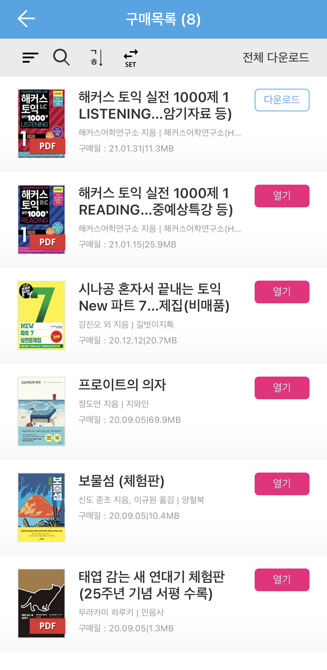구매목록입니다. 여기에는 제가 무료 또는 유료로 구매한 책의 리스트가 있습니다. 구매목록에 있다고 해서 기본 책장에 있는 건 아닙니다. 목록에서 다운을 받아야 기본 책장에 리스팅이 됩니다. 기기마다 다운로드를 받아야 하기 때문에 아이폰에서 보던 것이 아이패드의 기본 책장에는 없을 것입니다. 이럴 땐 당황하지 마시고 구매목록을 보셔서 다운 받았는지를 확인하시면 됩니다.