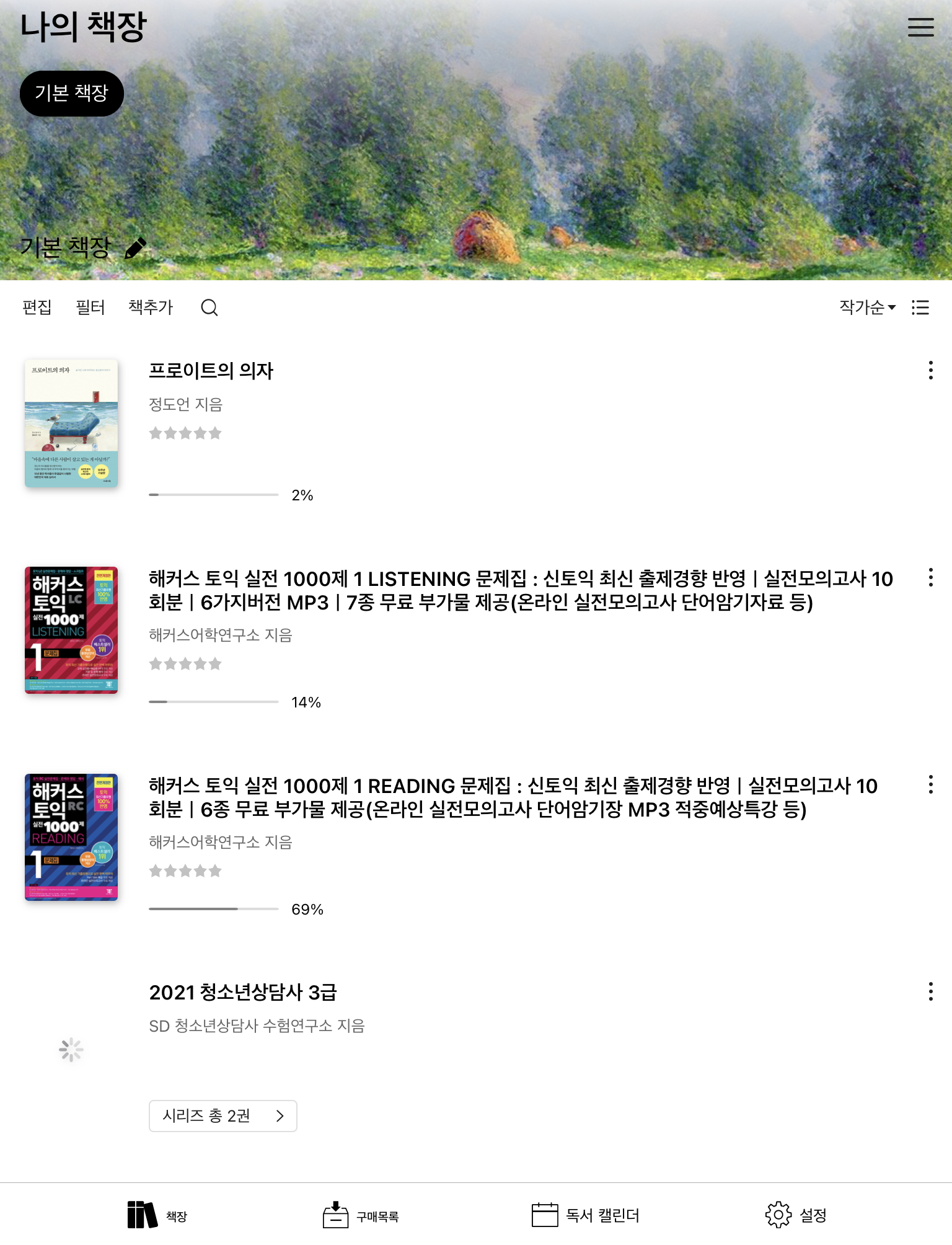 기본 책장부터 변경된 모습이 보입니다. 각 책장만의 배경화면을 설정할 수 있고요. 메뉴도 위계 있고 심플하게 바꾸었습니다. 아쉽게도 독서율은 원형 차트에서 막대로 바뀌었습니다. yes24어플도 이런 식이라서 차별점이 없는 게 아쉽고요. 원형으로 나타난 독서율이 더 좋았다고 봅니다. 이용하는 데에는 문제 없습니다.