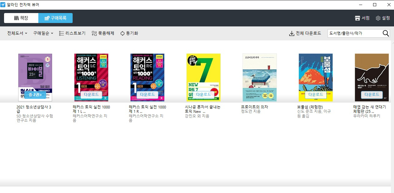 책장에는 구매목록의 모든 책이 표시되지 않습니다. 말씀드렸듯이 구매목록의 책들 중에서 다운로드를 한 책만 표시됩니다. 어플과 책장 자체가 동기화되지는 않기 때문에 컴퓨터에서도 원하는 책들만 받아보실 수 있습니다.