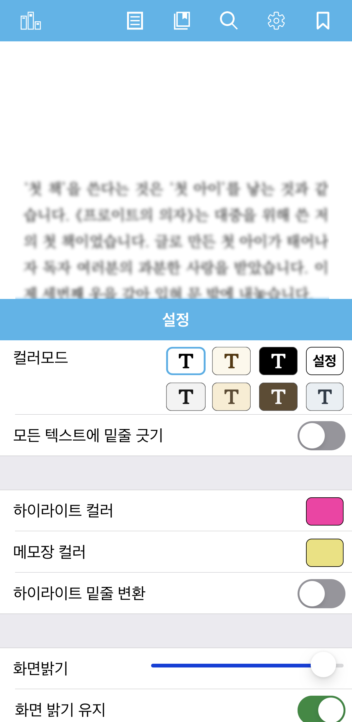 보기 설정 메뉴입니다. 이전 버전에 대해 저는 혹평한 적이 있습니다. 바로 "확실히 밀리의 서재 미만잡이라고 할 정도로 다른 어플들과 비슷한 수준의 인터페이스입니다."라고요. 구버전을 보시면 이해가 되실 텐데요. 조정을 할 때 쓰는 저 위아래 화살표가 불편했습니다. +1이나 -1 수준으로 나누는 것도 좋지만 터치와 슬라이드로 조정하는 게 스마트 기기에 맞다고 보았거든요.