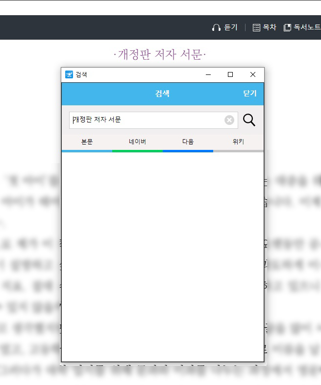 이렇게 검색 창에서 포인터가 깜빡일 때 원하는 문장을 복사, 붙여넣기 해서 쉽게 정리할 수 있습니다. 아쉽게도 하이라이트를 한 문장은 검색되지 않습니다. 이것까지 지원하면 참 좋겠네요.