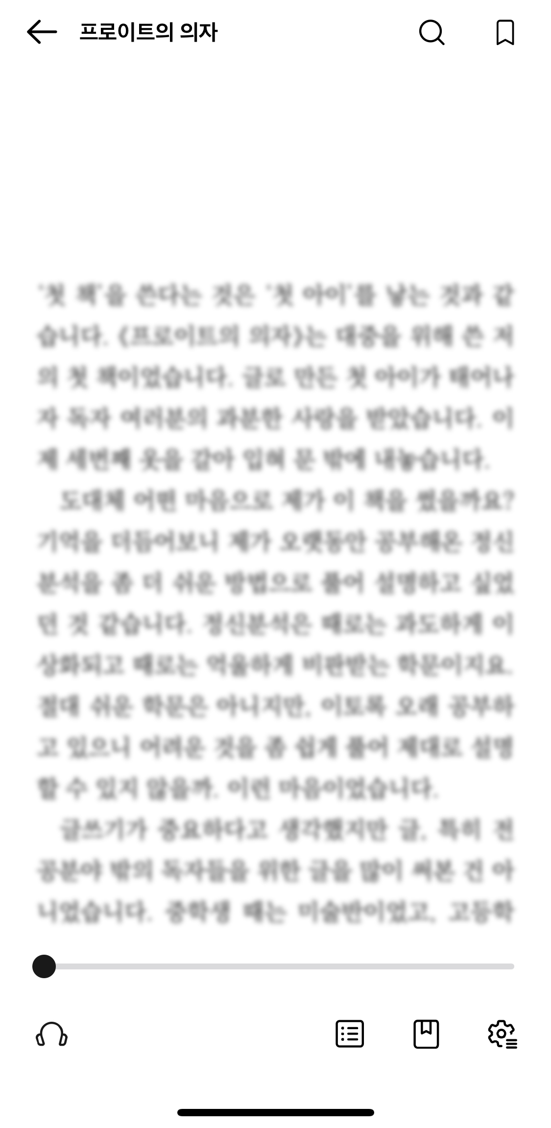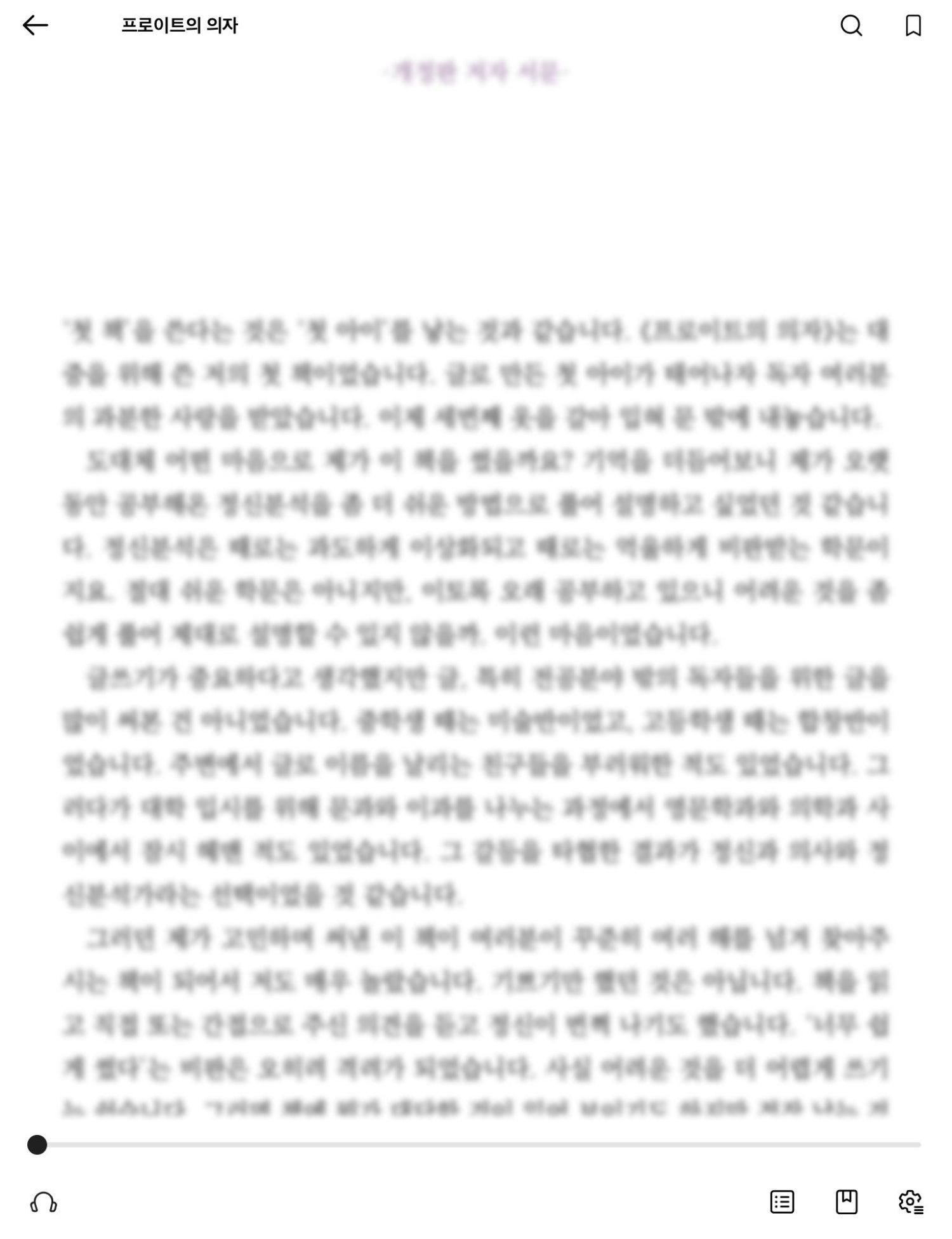 독서에 들어간 모습입니다. 아이폰과 아이패드 기기상의 차이는 거의 없습니다. 확실히 신버전이 무채색이 중심이라 그런지 구버전에 비해 심플하고 세련되 보입니다. 저는 개인적으로 독서 화면에서 책장으로 넘어가는 표시가 바뀐 데 만족하고 있습니다. 기존에는 막대그래프 같아 보이는 아이콘이었습니다. 눌러보고 나서야 '아 책장으로 돌아가는 버튼이구나'라고 알 수 있었죠. 그에 비해 화살표로 간단히 표시하니 책장으로 돌아가는 것임을 쉽게 파악할 수 있었습니다. 그렇지만 '하아... 이제야 조금 알아차리는 건가?'라는 생각이 들면서도 여전히 다른 어플과의 차별성이나 알라딘의 고유성에 대한 의문이 있네요. 이 이야기는 몇 번 반복해도 부족하지 않네요.