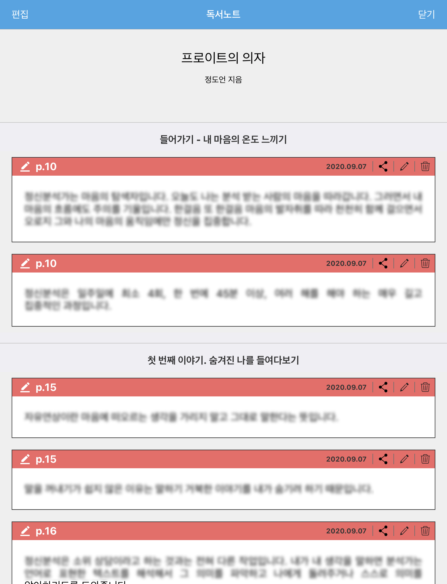 한 가지 크게 반가운 점이 있는데요. 구버전에서는 독서노트를 닫았다가 다시 열었을 때 이전에 보던 위치가 아닌 맨 처음으로 나와서 아쉬웠습니다. 제가 230페이지의 메모를 보기 위해 스크롤을 내려서 터치한 다음에 다시 독서노트를 누르면 맨 위부터 보였다는 의미입니다. 결국 다시 쭈욱 내려야했죠. 이 부분은 신버전에서 개선이 되었습니다. 독서노트의 어느 부분을 눌러서 해당 페이지에 갔더라도 다시 독서노트 버튼을 누르면 이전에 제가 보던 지점부터 볼 수 있습니다. 아주 잘 반영했기 때문에 칭찬하고 싶습니다.