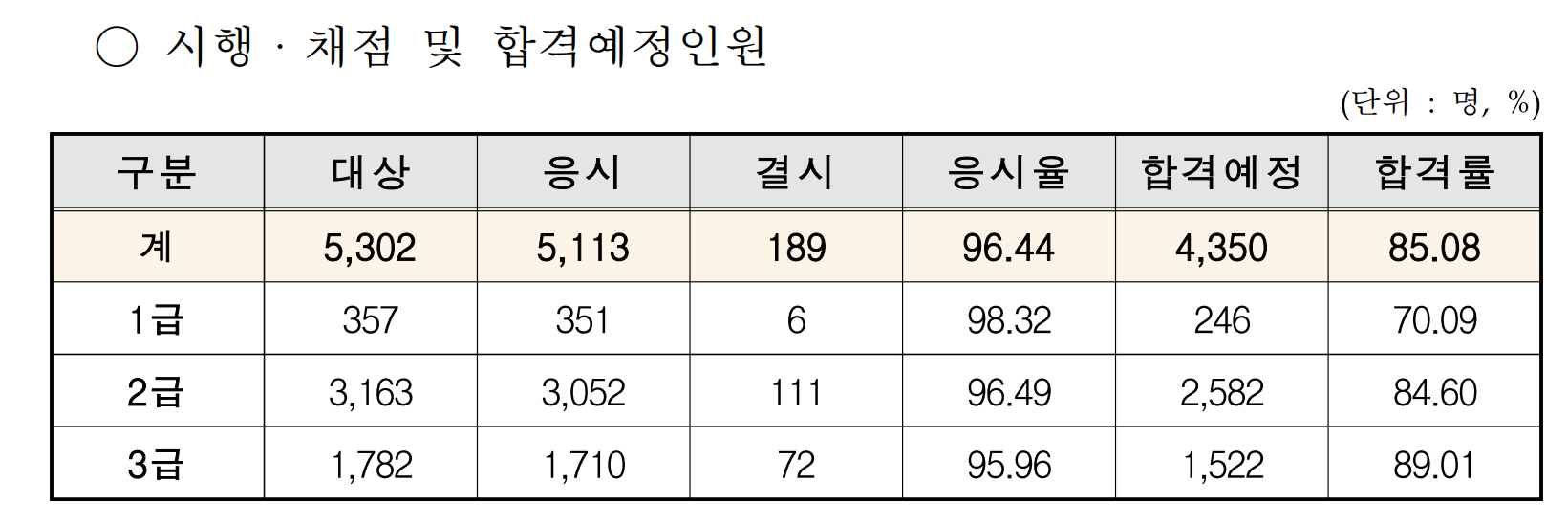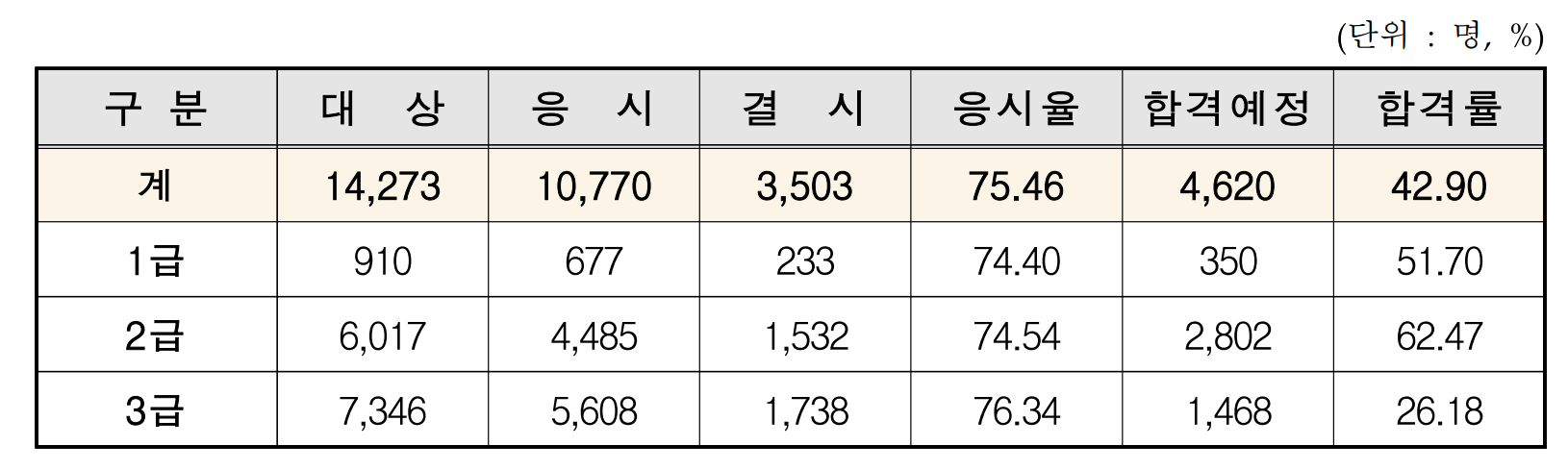 나중에 공고문을 확인해보았습니다. 1급부터 3급까지 더 높은 자격 순으로 합격률이 나왔습니다. 89%면 10명 중 9명은 붙었다는 의미죠. 필기 합격률과 대비되는 실기 합격률입니다. 추가 자료에 있는 연령과 성별에 따른 합격률을 보면 깜짝 놀라실 수 있습니다. 3급 기준 20대 이하 합격한 수험자의 수가 나머지 연령대에서 합격한 수험자의 수와 비슷합니다. 1급과 2급은 해당하지 않는 현상입니다. (심지어 1급에서 20대 이하 2명이 나온 게 신기할 뿐이죠.)