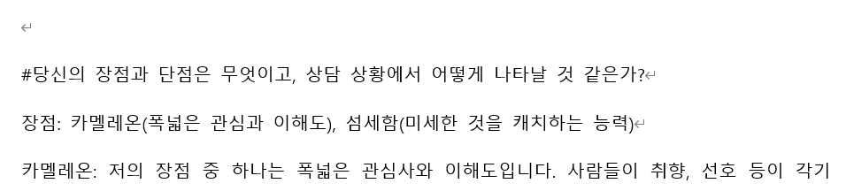 2번 질문은 사례 속 내담자의 강점과 약점에 대한 질문이었습니다. 제가 말씀드린 틀의 2번째 내용이었죠. 약점까지 물어봐서 그런지 생각했던 강점을 까먹었습니다. 그래서 약점을 먼저 말한 뒤에 강점을 천천히 뜸을 들이며 얘기했습니다. 이전 대학원 면접에서 천천히 차분하게 얘기한 옆 사람을 떠올렸습니다. 조급하게 말하는 것보다 뜸을 들이더라도 차분하게 말하는 게 더 말을 잘 하는 것처럼 보이더라고요.