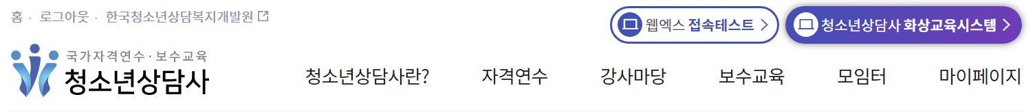 이렇게 사전 과제를 연수 전날까지 마치셨다면 안심하고 연수로 들어가시면 됩니다. 연수는 웹엑스라는 프로그램을 통해 진행되는데요. "한국청소년상담복지개발원"의 "청소년상담사" 홈페이지 우측 상단의 "청소년상담사 화상교육시스템"을 들어가면 됩니다. 자세한 건 연수 전날에 사전 테스트를 진행하니 그걸 참고하시면 됩니다.
