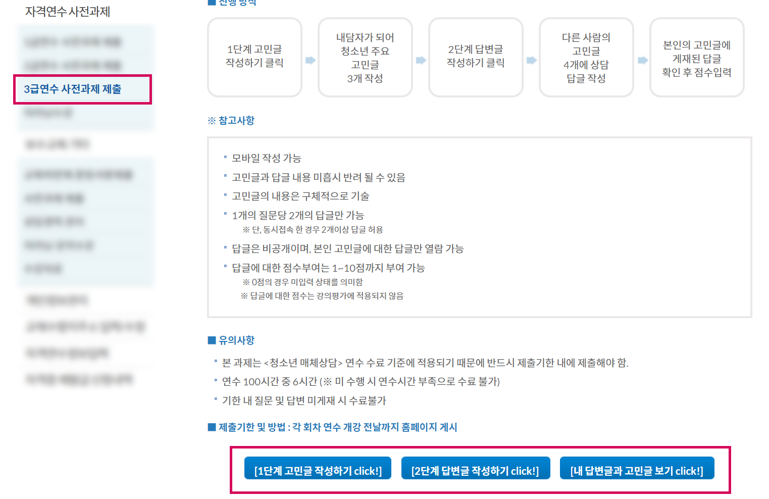 1.사이버 상담 체험은 위의 홈피-마이페이지-자격연수 사전과제-3급연수 사전과제 제출에서 하셔야 하는데요. 먼저 청소년의 입장이 되어 고민글 3개를 작성하고요. 3개 작성이 완료되면 다른 연수생들이 작성한 고민글 중에서 4개에 상담자로서 답글을 적으시면 됩니다. 답글은 최소 900자 이상 적으셔야 해서 부족하다거나 길다고 느끼실 수 있어요. 시스템 상에서는 최대 1200자까지 적을 수 있었던 걸로 기억하는데요. 저는 적을 내용은 많은데 공간이 작다고 느꼈습니다.