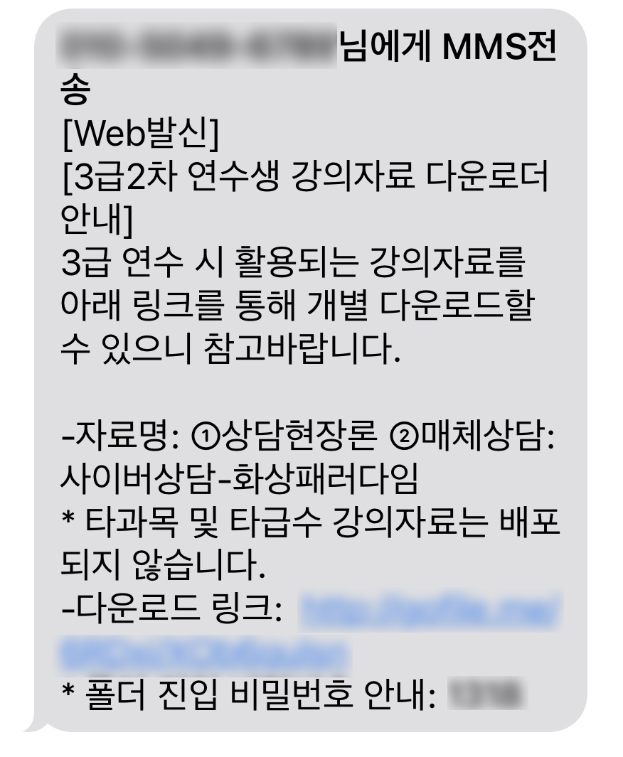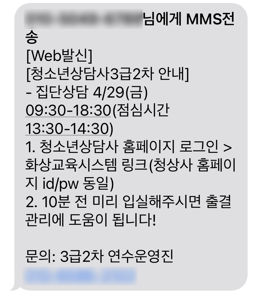 한국청소년상담복지개발원에서는 연수 전부터 연수 이후까지 세세하게 문자를 보내줍니다. 꼼꼼하게 챙겨주셔서 정말 감사했습니다. 첫날 강의 끝나고 지쳐있었는데, 그걸 잘 아시고 힘드시지 않았냐, 수고하셨다는 문자 덕분에 조금이라도 힘을 내서 다음날을 준비할 수 있었죠.