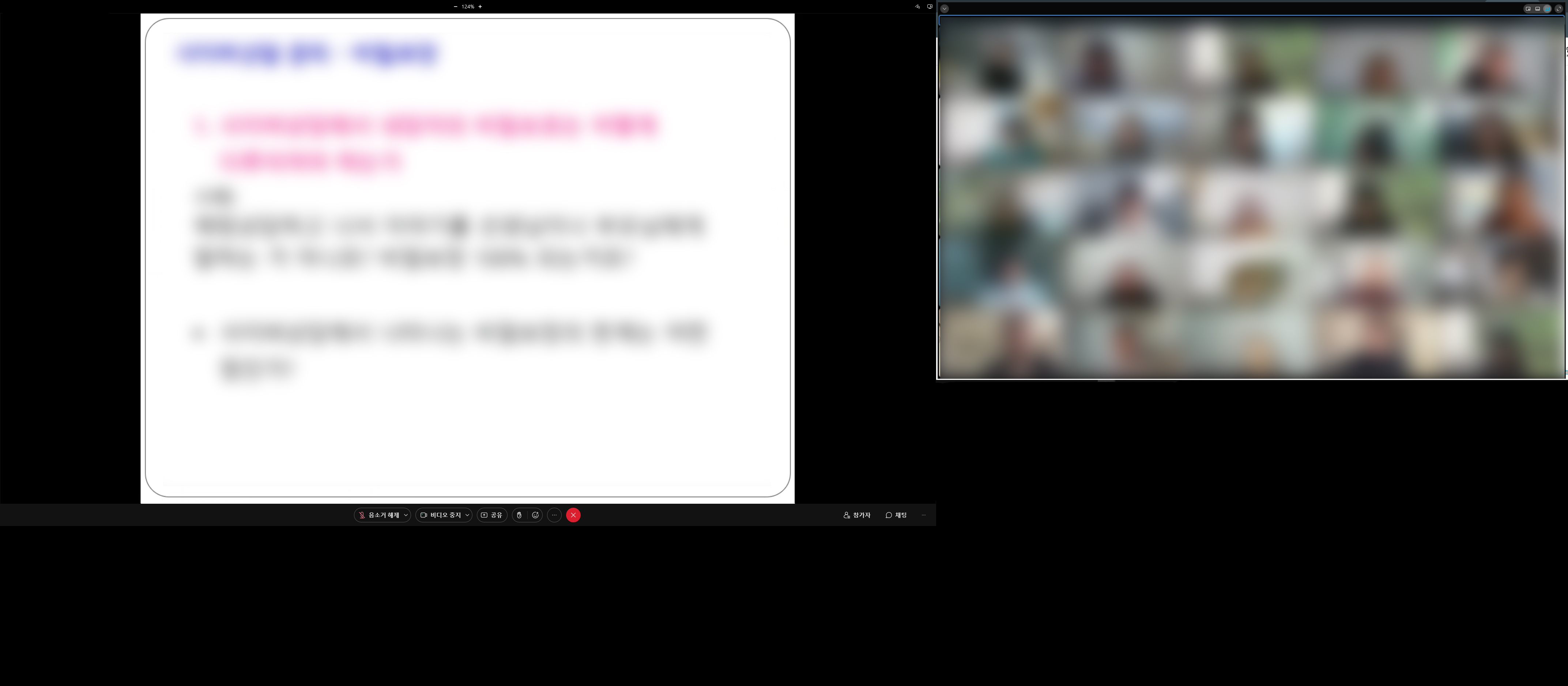 연수는 대개 20명이 1조로 나뉘어 1~2조 형태로 진행이 됩니다. 집단상담은 인원이 중요하기 때문에 1조(20명)로, 일부 강의는 2조(40명)으로 진행되죠. 연수 중에는 본인 영상을 반드시 켜두고, 소리는 음소거한 상태로 있다가 발언할 때 음소거 상태를 해제하고 말씀합니다. 저희 조는 이런 것들을 아주 잘 지켜주셔서 물 흐르듯이 흘러갔네요.