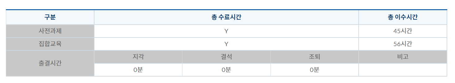 그리고 이렇게 총 수료시간이 나타납니다. 사전과제와 집합교육을 수료했는지, 집합교육 시 출결이 어땠는지 등이 나옵니다.