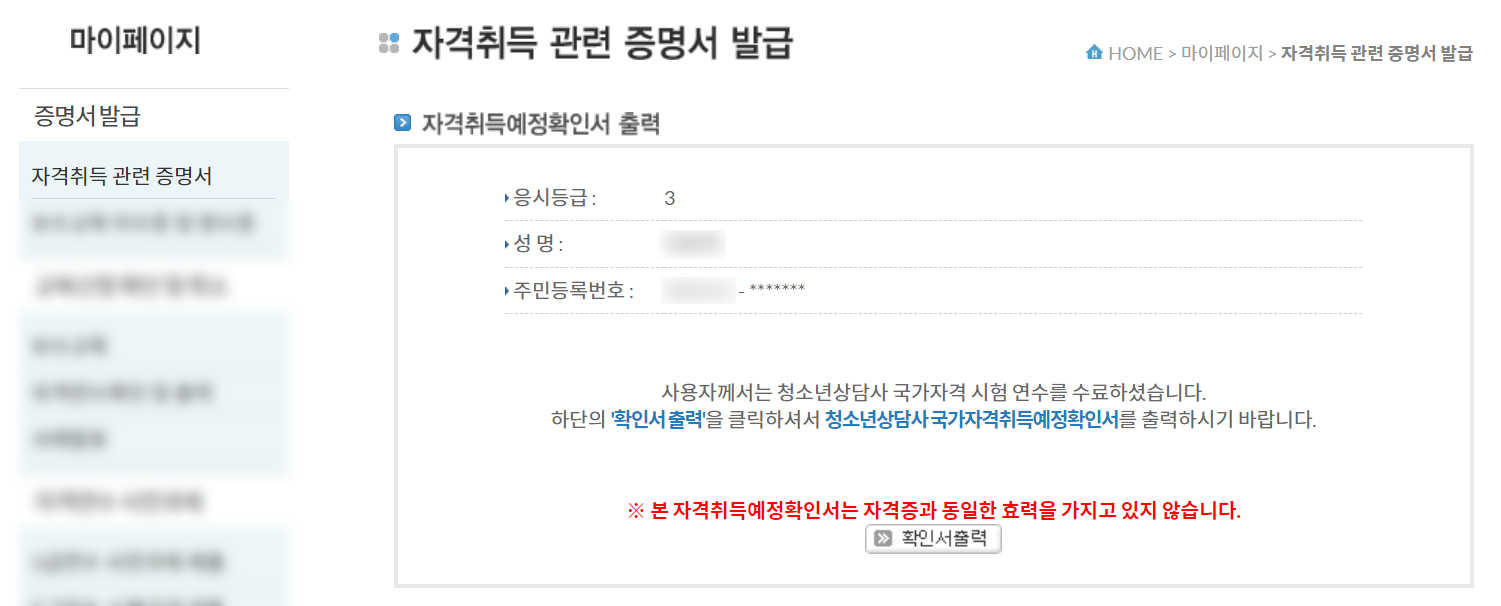 사후 설문 후 몇일이 지나면 자격취득예정확인서를 출력할 수 있습니다. 이제는 끝났다는 얘기죠. 자격증 종이 자체야 7~8월 사이에 나오지만 필요하시다면 이걸 사용하실 수 있습니다. 물론 아래 이미지의 빨간 글씨의 내용처럼 이건 자격증과 동일한 효력을 지니지 않습니다. 단지 연수까지 수료했으니 자격취득이 예정되어있다는 의미입니다.