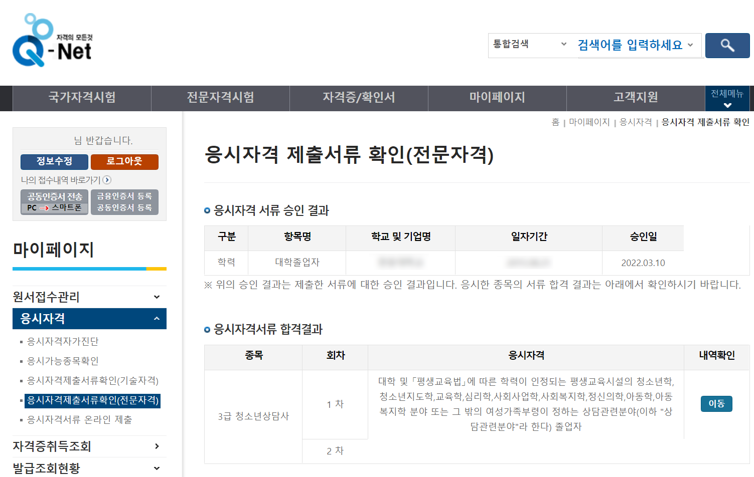 청소년상담사 자격증은 여성가족부에서 주관하고 있는데요. 그래서 실기(면접)를 합격하고 바로 자격증이 나오지는 않습니다. 최종 합격이 다음 해 3월에 나옵니다. 그래서 22년 3월에 최종합격이 떴습니다. 최종합격 전에는 응시자격서류를 제출해야 합니다. (요 포스팅을 못했네요...)