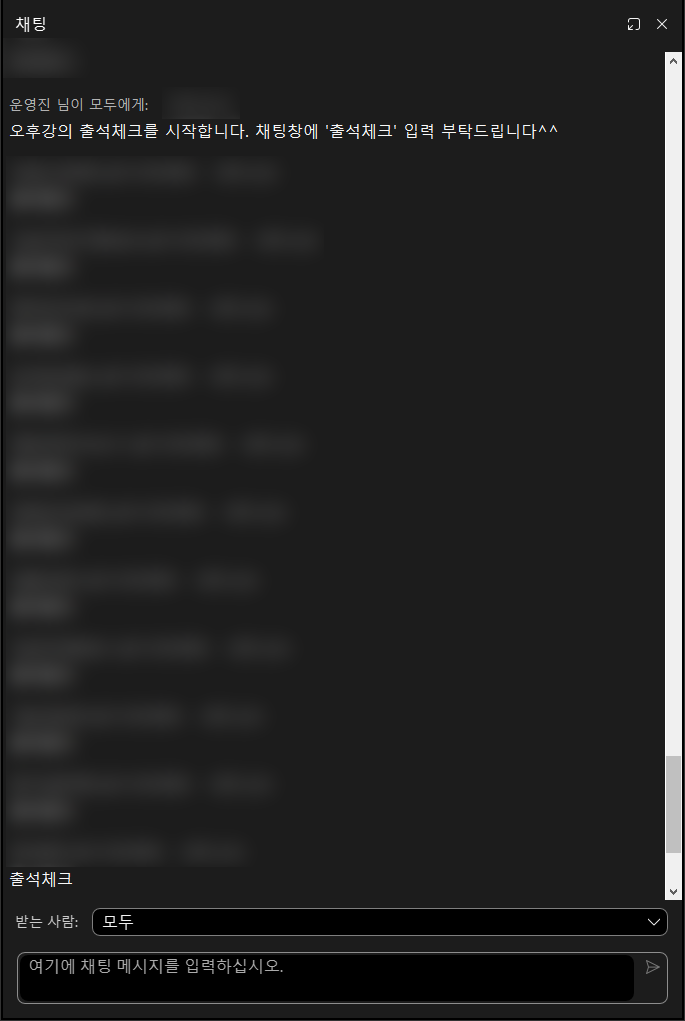 연수에서 출석체크는 아주 중요합니다. 앞서 말씀드렸듯이 100시간을 채워야 하는데 총 시간이 101시간이니 1시간 이상 놓치면... 그래서 강의 시작 전과 후, 점심시간 전후에 출석체크를 진행합니다. 채팅으로 하고요.