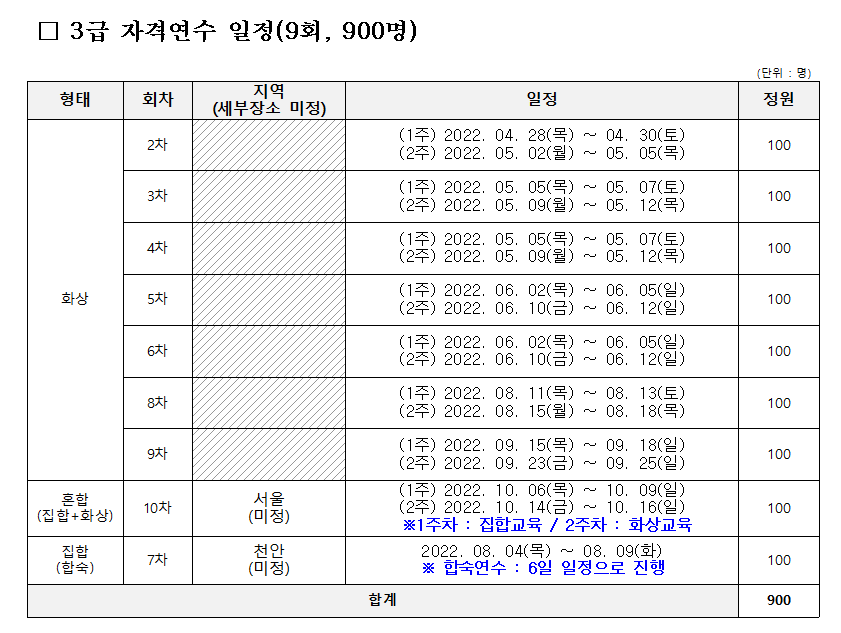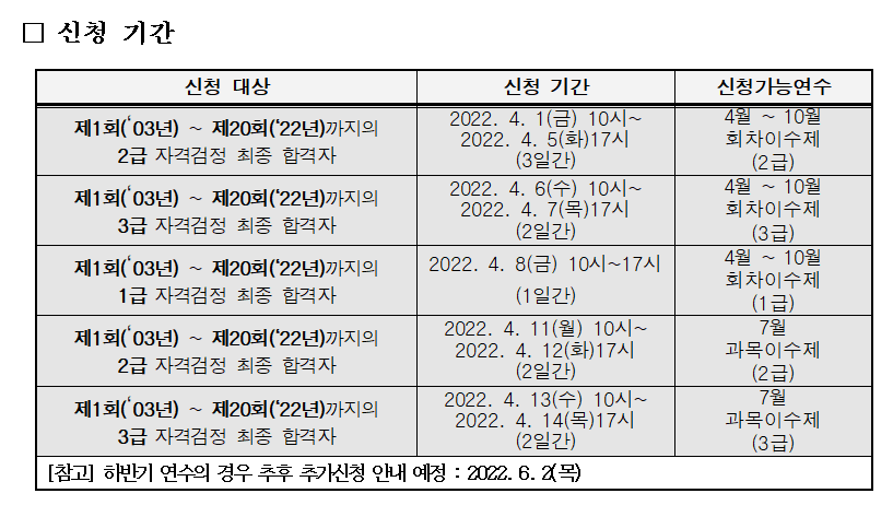 3월에 서류 승인이 되기 때문에 저는 빠르면 2분기부터 열리는 자격 연수에 참여할 수 있었습니다. 보통 2-4분기를 묶어서 연수 신청을 받는 것 같습니다. 그래서 해당되는 신청 대상에 맞는 신청 기간을 잘 확인하셔야 합니다. 저는 제20회 3급 합격자이기 때문에 22년 4월 6일 10시부터 4월 7일 오후 5시 사이에 신청을 해야 했죠. 신청기간 이후에는 신청이나 수정이 불가능한데요. 그래도 추가 시행계획이 공지에 뜨기도 해서 놓쳤다면 잘 확인해봐야 합니다. 물론 기간은 좀 뒤로 밀리겠죠.