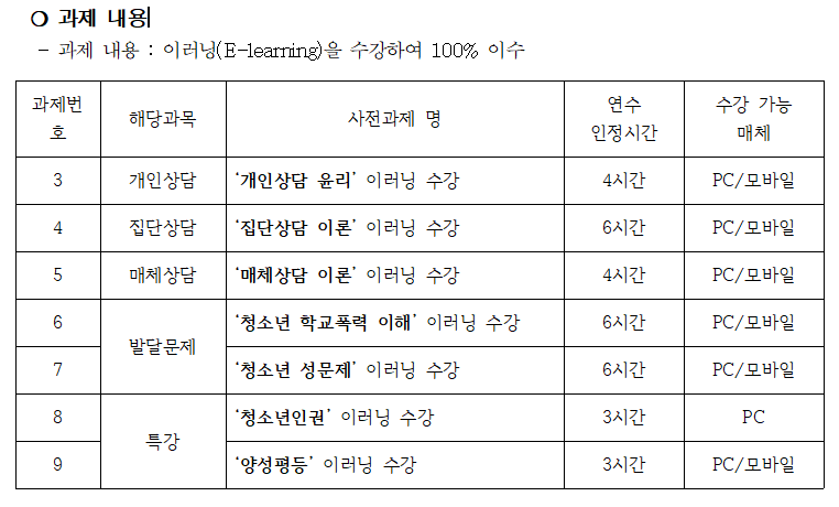 사전과제는 1.사이버 상담 체험, 2.거주 지역 청소년 관련기관 조사&분석, 3.이러닝(e-learning)이 있습니다. 제출 기한은 각 회차 연수 전날 24시까지니 일찍 끝내두는 게 정신건강에 좋습니다.