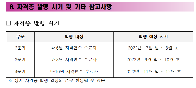 그렇지만 자격 연수를 수료한다고 바로 자격증이 발급되지는 않습니다. 발행 예정 시기가 정해져있기 때문인데요. 아래 공고문의 표에서 보듯, 2분기에 자격 연수를 받으면 빨라야 7월 말에 자격증을 발행받을 수 있습니다. 4분기에 연수를 수료하면 11월 말 정도에 발행이 되고요. 연수를 늦게 받을수록 자격증이 늦게 나오게 되는 거죠.