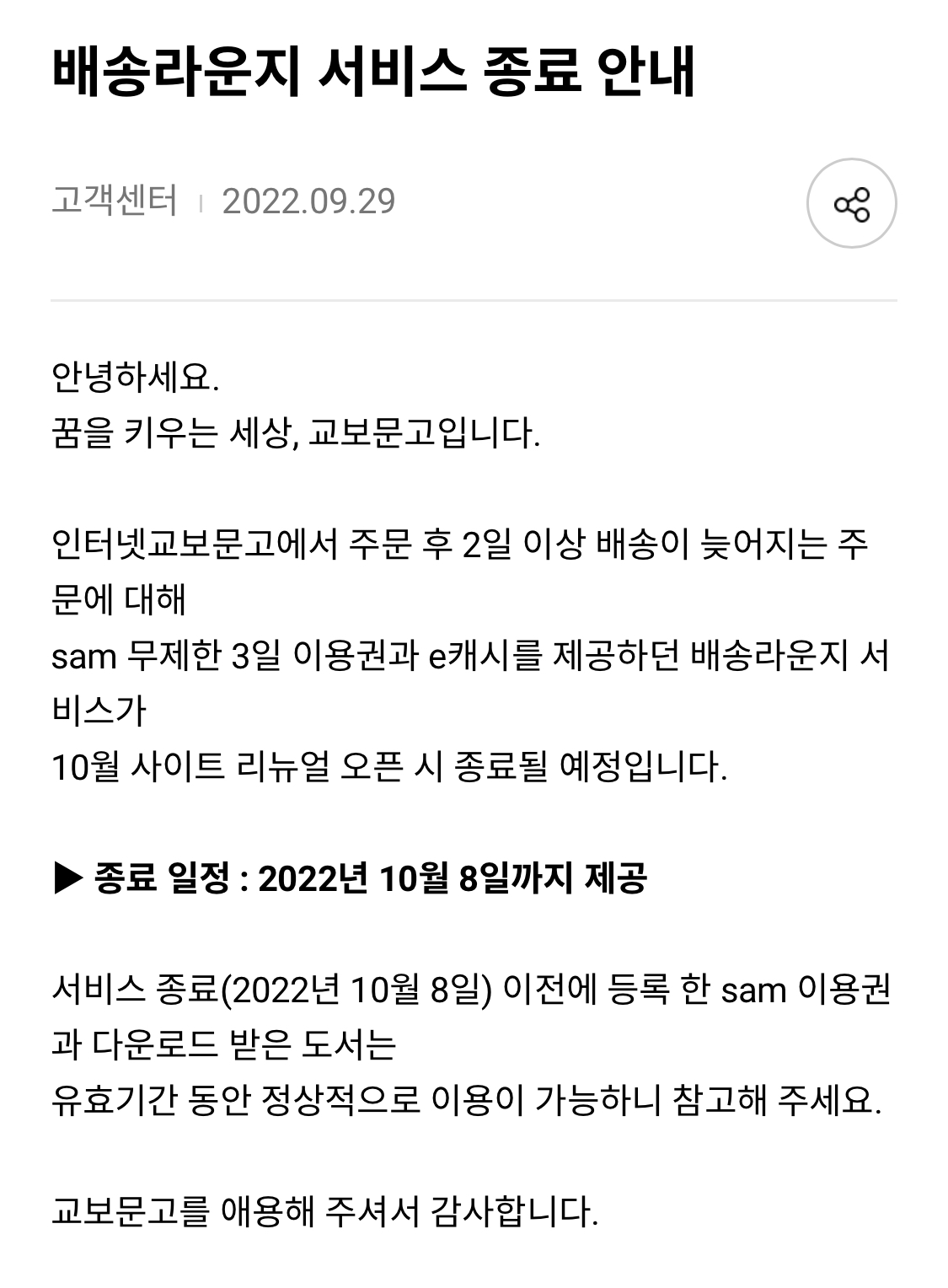 “교보문고 배송라운지” 서비스가 22년도 10월 리뉴얼 이후로 종료되었다고 합니다. 짧은 기간이라도 종이책 배송 후 전자책을 볼 수 있어서 즐거웠습니다. 아래 공지 사진을 남깁니다. 또한 포스팅은 그대로 남겨두겠습니다.