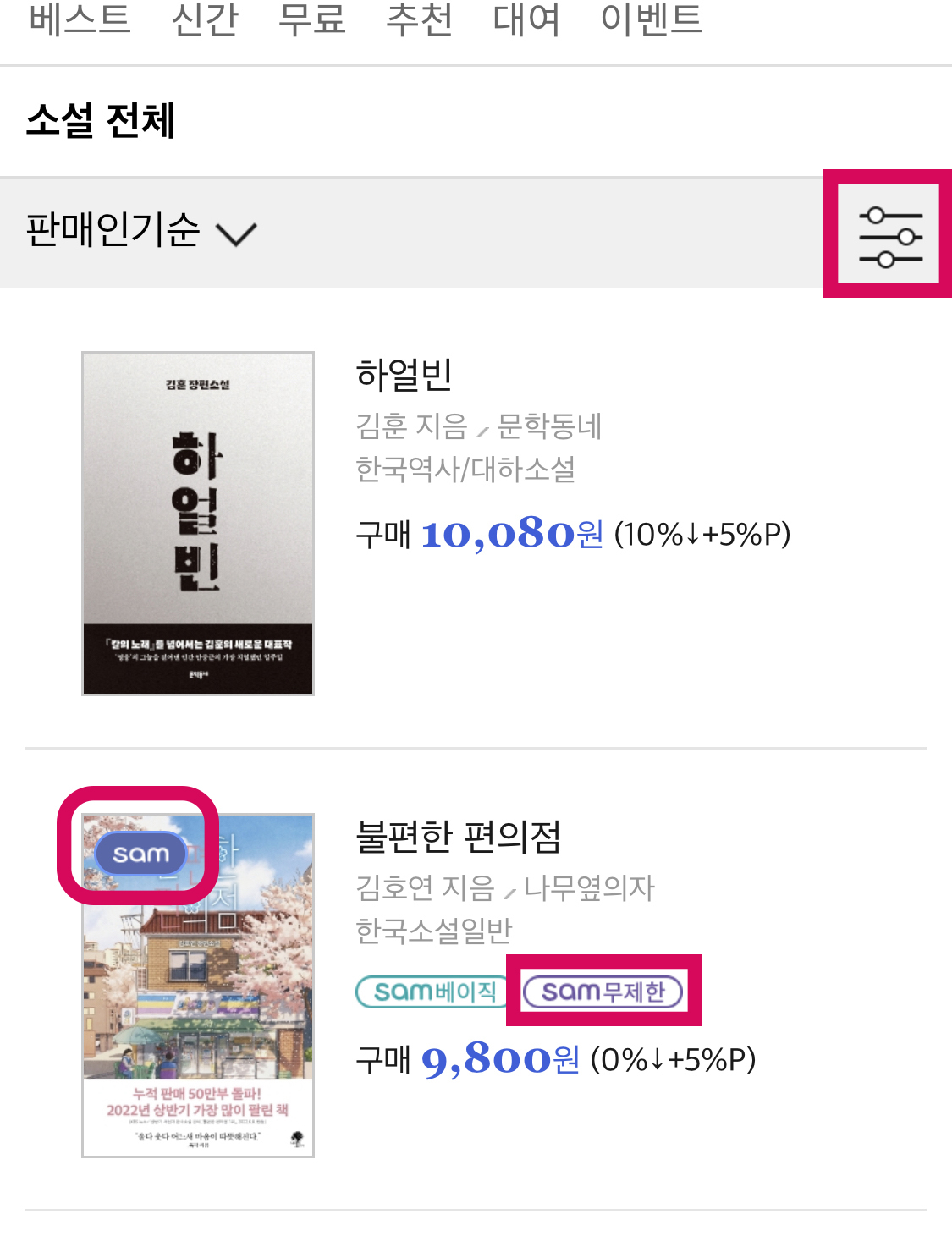 "소설 전체" 카테고리를 눌렀습니다. 그러면 책들이 아래로 쭈욱 나오는데요. 여기는 일반적인 전자책 대여나 구매만 가능한 책들도 나열됩니다. 배송라운지 혜택은 sam무제한이기 때문에, 무제한에 포함된 책을 골라야 하죠. 해당 책들은 보통 표지 왼쪽 상단에 "sam"이라고 써 있고요. 그 오른쪽에 sam베이직과 sam무제한이라고 적혀있습니다.